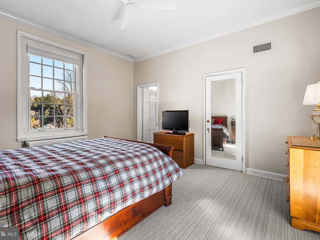 A bright, spacious bedroom features soft beige walls and a high white ceiling with decorative crown molding. A large window on the left wall allows natural light to fill the space and provides a picturesque view of greenery outside. The room’s furnishings are classic and understated, with a wooden sleigh bed dressed in a plaid bedspread, a low wooden dresser on the right topped with a traditional lamp, and a matching wooden TV stand opposite the bed. A mirrored door adds dimension and utility, while plush light-gray carpeting enhances the comfort and warmth of the room.