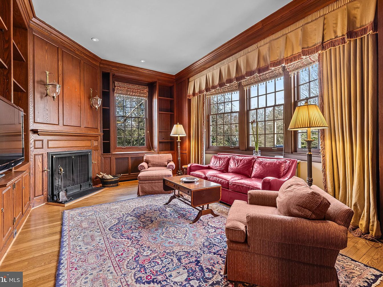 This room features warm wood-paneled walls with intricate molding and built-in shelves, creating a stately yet cozy library ambiance. Large multi-paned windows allow natural light to flood in, accented by thick, pleated gold curtains with a decorative valance. A rich red leather sofa and matching armchairs anchor the seating area around a dark wood coffee table. A classic fireplace with a black grate and a basket of firewood adds a traditional touch. Elegant brass wall sconces and a tall floor lamp provide soft lighting, while a colorful Persian-style rug brings together the space’s refined atmosphere.