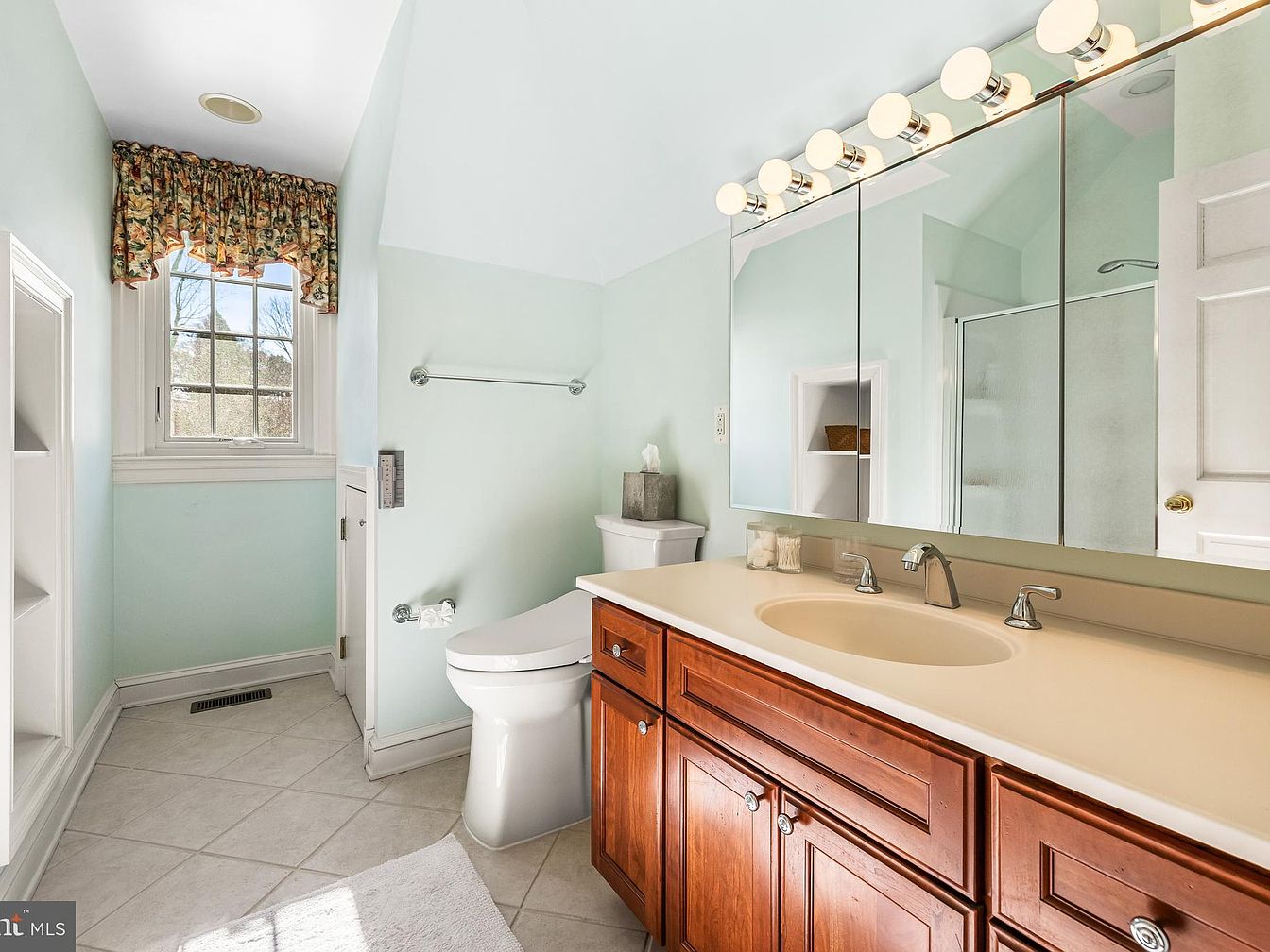 A bright and airy bathroom featuring a long vanity with a light beige countertop and rich cherry wood cabinetry, topped by a wide mirror with a row of modern round vanity lights overhead. The walls are painted a soft mint green, enhancing the space’s freshness. A white toilet is set beside a small window, dressed with a gathered floral valance. The floor is tiled in a neutral mosaic pattern, complemented by a plush white bath rug. Built-in open shelving and a partial view of a glass shower door add both utility and interest. The overall look is clean, traditional, and inviting.