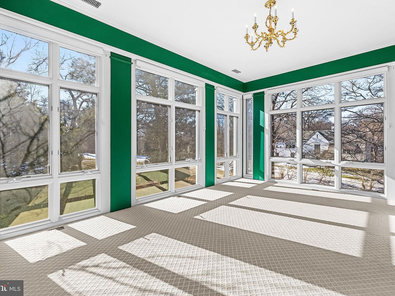 A bright and airy sunroom features floor-to-ceiling windows on three sides, allowing abundant natural light to stream across the space. The walls are painted a deep emerald green between the white window frames, creating a bold contrast and an elegant look. The floor is covered with a light beige, textured carpet, adding warmth underfoot. A classic gold chandelier hangs from the crisp white ceiling, giving the room a touch of historic charm. Outside the windows, leafless trees and a distant cottage can be seen, enhancing the peaceful, nature-inspired ambiance of this inviting space.