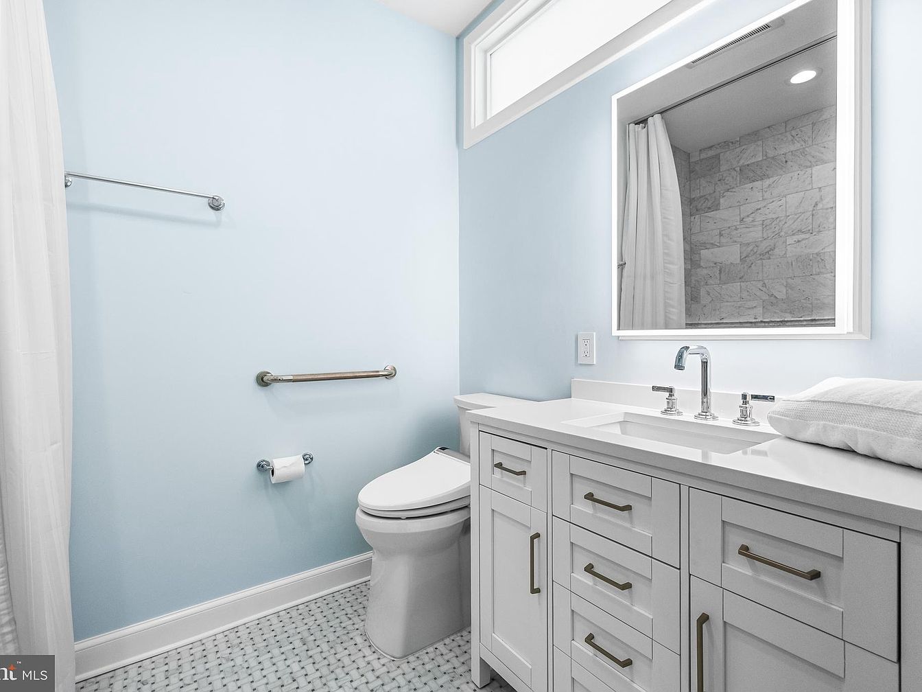 A bright and airy bathroom with pale blue walls features a white shaker-style vanity topped with a sleek integrated sink and chrome faucet. An illuminated mirror above the vanity casts a gentle glow. The floor is tiled in a light basketweave pattern, adding texture to the space. A modern toilet sits beside the vanity, flanked by a minimalist chrome grab bar and toilet paper holder for accessibility. Subtle brushed nickel or chrome hardware accents the cabinetry. A high transom window above the mirror allows daylight in while maintaining privacy. The overall aesthetic is clean, contemporary, and serene.