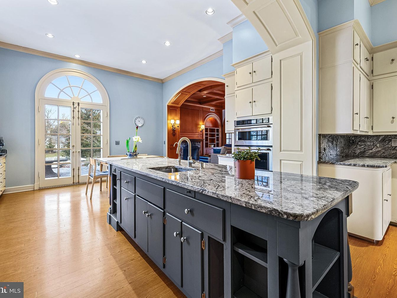 A spacious kitchen unfolds with pale blue walls and warm honey-toned wood floors, crowned by elegant white cabinetry offering ample storage all around. The central focus is a large dark-blue kitchen island topped with polished granite, equipped with a sink and open shelving below. Large arched double doors framed by delicate trim allow abundant natural light to cascade in, illuminating a small breakfast table beside them. To the right, built-in double ovens and marble-look countertops add modern touches, while a wide archway with paneled detailing leads seamlessly into a warmly paneled adjoining room, suggesting open-concept flow throughout the home.