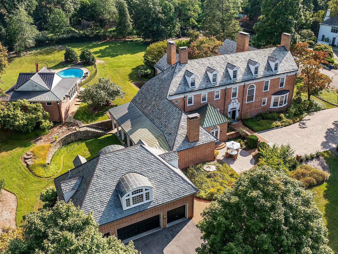 A sprawling brick mansion with a classic historical American architectural style sits atop a meticulously landscaped yard. The main house features steeply pitched slate roofs, dormer windows, and several tall chimneys. A detached garage with arched windows connects to the home via a curved brick walkway. The lush green lawn extends to a pool house with an adjacent, fenced-in circular swimming pool, and mature trees line the property providing privacy and shade. Hedges, shrubs, and flower beds edge the stone paths, while outdoor seating and patios create inviting spaces for relaxation, accentuating the home’s grand and timeless charm.