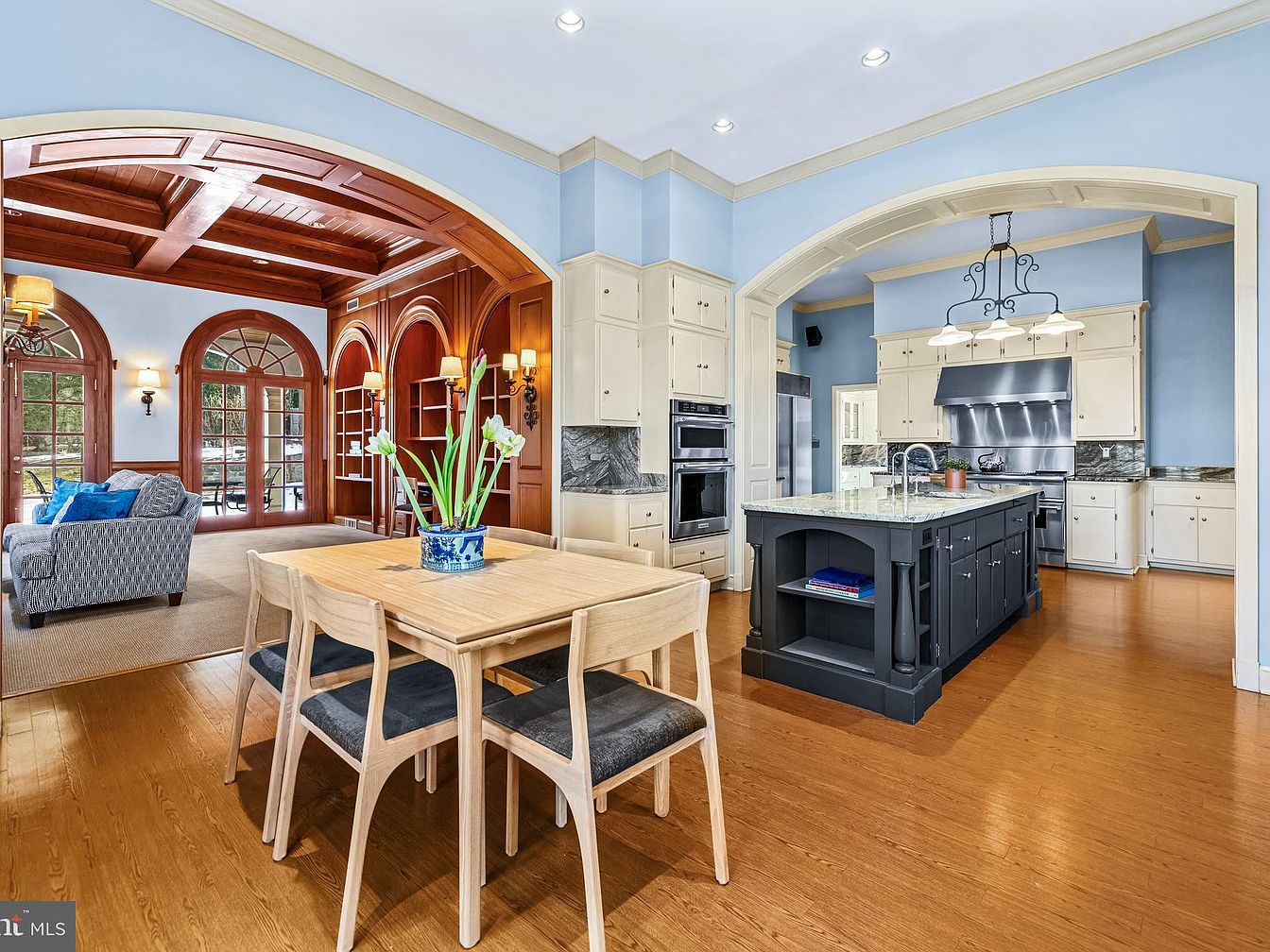 Open-concept kitchen and dining area featuring pale blue walls, white cabinetry, and natural wood flooring. The kitchen centers around a dark navy island with a stone countertop and built-in shelving. Above the island, a wrought-iron chandelier provides ambient lighting. Stainless steel appliances and a stone backsplash complement the cabinetry. The adjacent casual dining set is light wood with four chairs upholstered in dark fabric, and a ceramic centerpiece holds fresh flowers. Through a wide archway, the living room boasts rich wood paneling, built-in shelves, coffered ceilings, and arched double doors, enhancing the warm, classic atmosphere.
