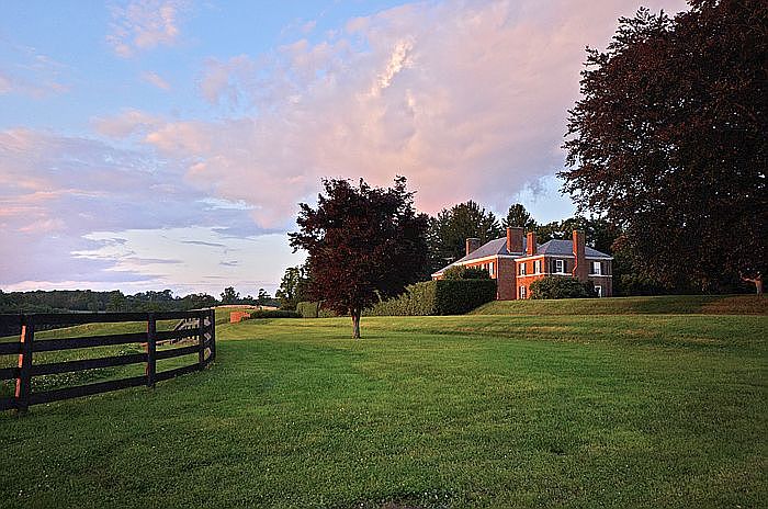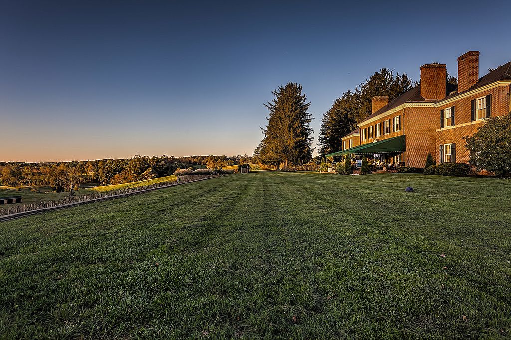 A classic American historic home nestled in a lush green landscape, featuring a spacious yard bordered by a rustic wooden fence. The brick facade showcases traditional architecture with multiple gabled roofs and prominent chimneys. Lush trees, including a vibrant red maple, frame the picturesque scene against a backdrop of soft pastel skies at dusk. The expansive lawn is meticulously maintained, emphasizing the home’s grandeur and inviting ambiance. This serene setting beautifully reflects natural beauty, combining well with historical charm and inviting tranquility in a countryside atmosphere.