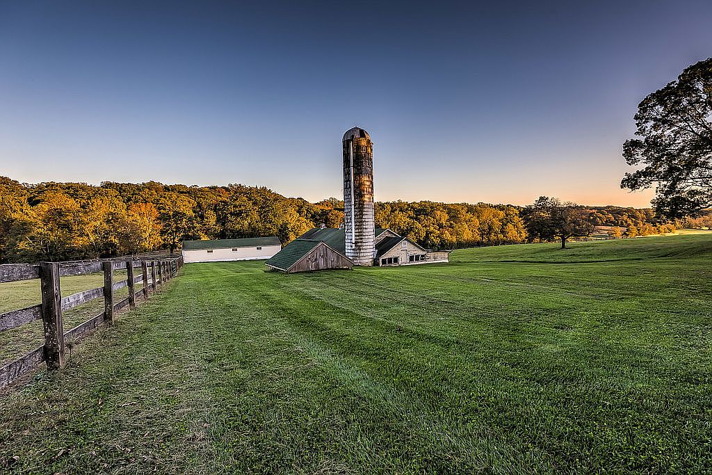 The image highlights a rustic barn set against a backdrop of rolling green fields and a dense tree line in the distance. The barn features traditional wooden siding, with a weathered aesthetic enhanced by the tall, cylindrical silo nearby. A gently sloped green roof complements the barn’s earthy tones. A wooden fence lines the path leading to the barn, framing the expansive lawn and creating a sense of openness. The scene captures the serene beauty of rural life, especially during the golden hour, as soft sunlight bathes the landscape, evoking a peaceful and nostalgic atmosphere.