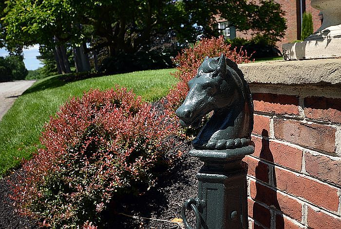 The image features an ornate iron post topped with a detailed horse head sculpture, emphasizing a historical aesthetic. Surrounding the post, vibrant foliage adds lush contrast with deep greens and rich maroon hues from the manicured shrubbery. The brickwork of the pillar is warm-toned, complementing the lush landscape while framing the entrance to the home. In the background, a neatly trimmed lawn leads to a cobblestone path, inviting visitors. Sunlight streams in, highlighting the intricate craftsmanship of the ironwork and the natural beauty of the surrounding garden, enhancing the elegant, classic charm of this historic property.