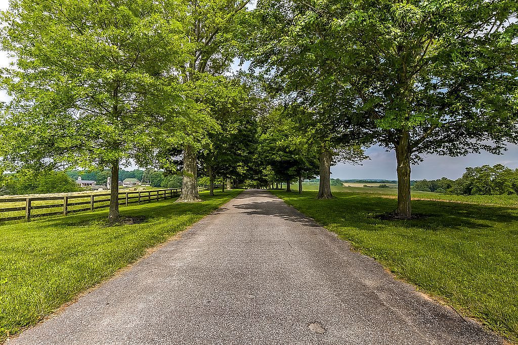 A scenic driveway is lined with lush, verdant trees, creating a natural archway that guides the eye towards the house in the distance. The path is gravel, curving gently through a landscape of vibrant green grass and well-maintained surroundings. A wooden fence borders one side, adding rustic charm and framing the space. Beyond the trees, rolling hills and open fields stretch out, suggesting a tranquil and inviting rural atmosphere. The overall color palette is dominated by varying shades of green, with hints of brown from the driveway and fencing, giving a serene, pastoral feel to this charming entrance.