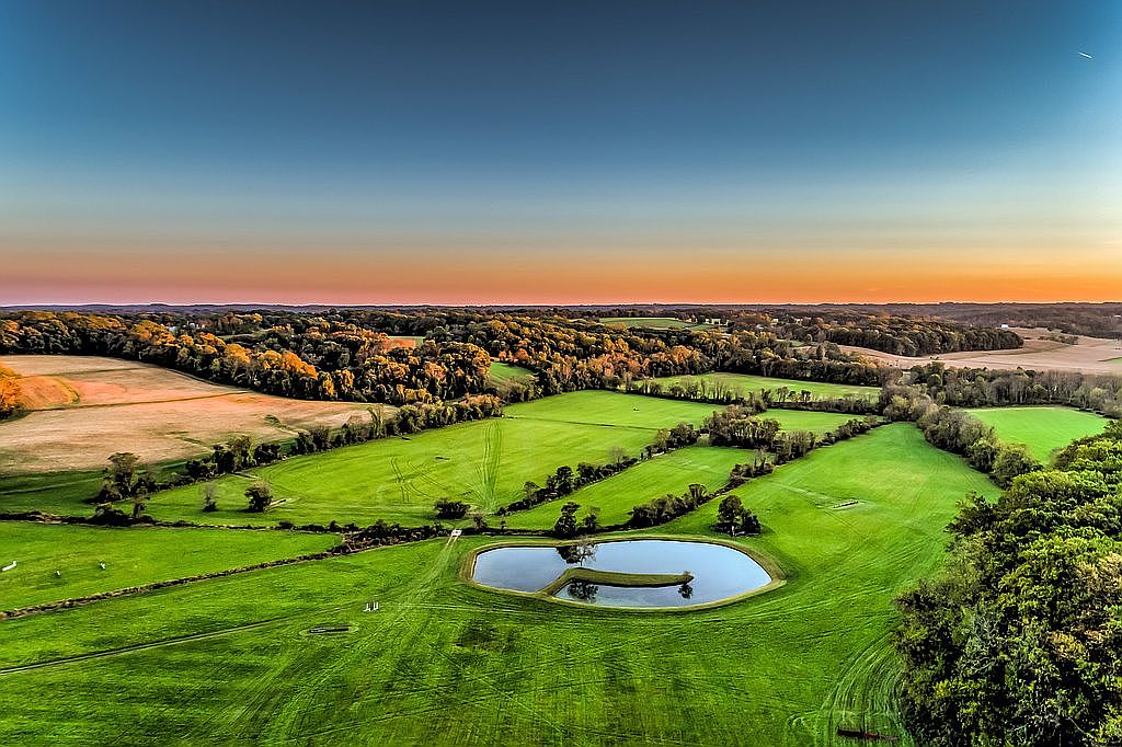A sweeping aerial view reveals a picturesque landscape featuring lush green fields segmented by hedgerows. A serene pond reflects the twilight sky, surrounded by rolling hills adorned with vibrant autumn foliage. The horizon showcases a gradient of colors transitioning from deep blue to warm pink and orange, signaling sunset. Varied textures create a visual rhythm, with cultivated fields alternating between crops and grassy areas. A few animals can be spotted, adding life to the tranquil scene. This harmonious blend of natural elements and soft lighting enhances the overall beauty of the rural setting, inviting quiet contemplation.