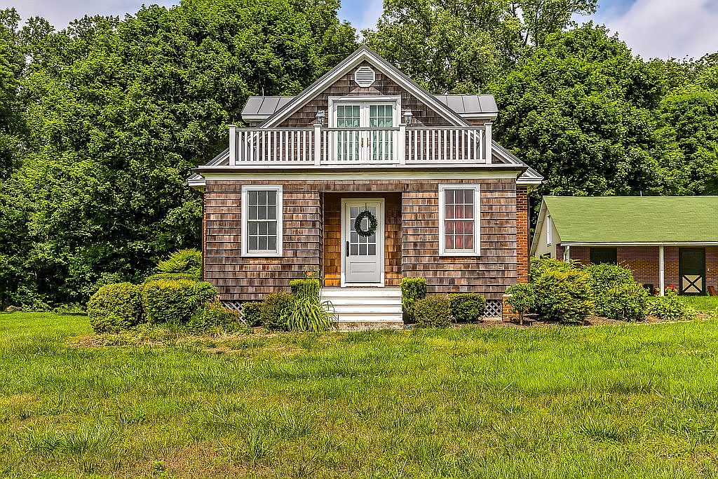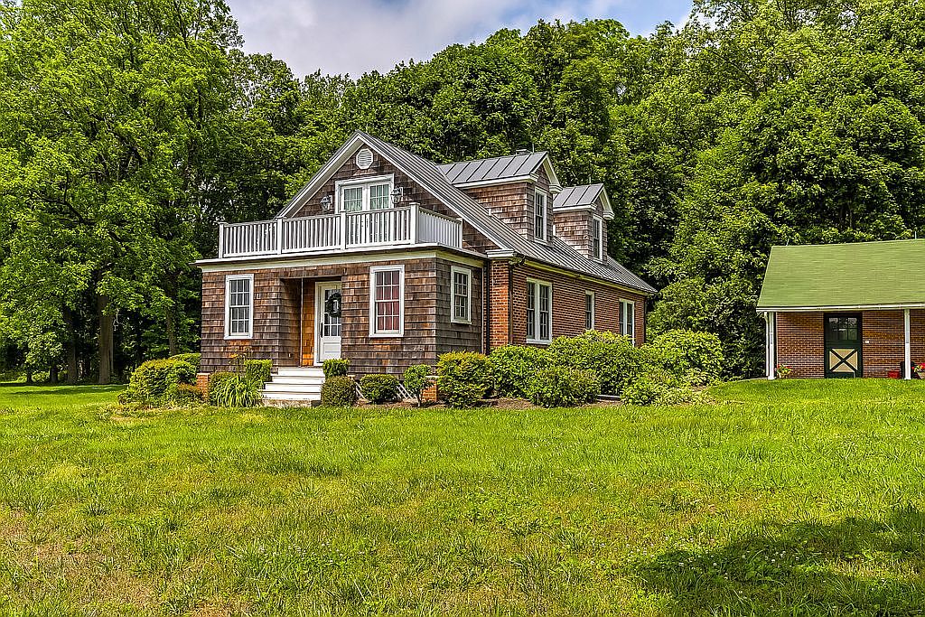 A charming historic American home features a mix of textured brown shingles and warm brick, giving it an inviting character. The house is adorned with large, symmetrical windows framed by white trim, enhancing its classic beauty. A welcoming front porch leads to the entrance, while a small flight of steps adds to its grandeur. Above, there’s a spacious balcony with a wooden railing. The sloped roof showcases a blend of gray materials, hinting at traditional craftsmanship. Surrounding green lawns and mature trees provide a serene backdrop, enhancing the home’s picturesque setting, while a nearby shed adds practicality.