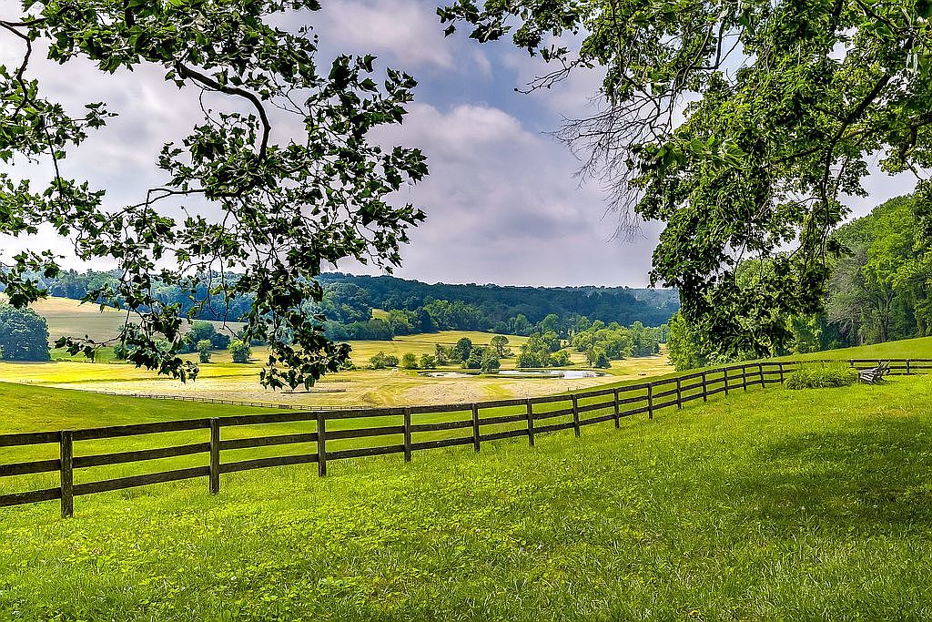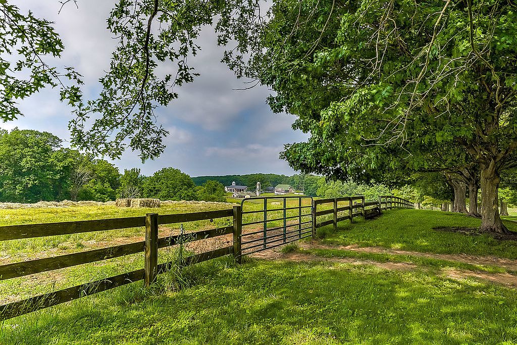 A scenic view of a historic American property, featuring a rustic wooden fence running alongside a lush green field. Mature trees with dense foliage provide a natural canopy, adding an inviting shade. Beyond the fence, several hay bales are nestled in the grassy expanse. In the background, a charming house peeks through the treeline, showcasing traditional architecture. The color palette consists of vibrant greens from the grass and leaves, and earthy tones from the fence. The sky transitions from a soft blue to grey, indicating a serene yet dynamic atmosphere, embodying a tranquil rural lifestyle.