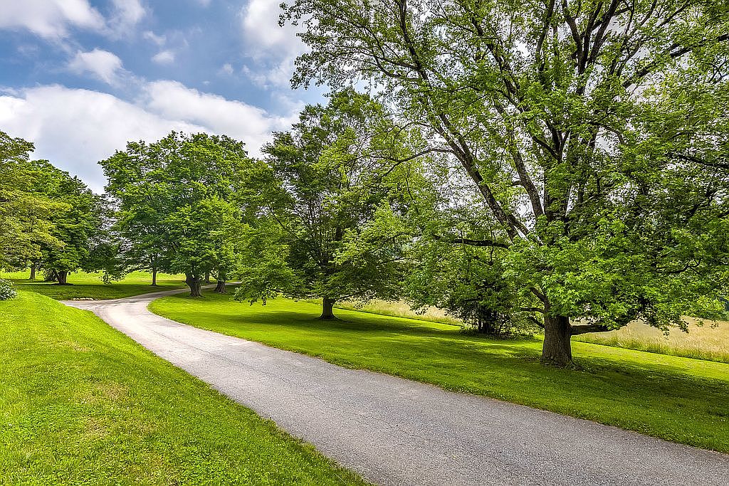 A serene driveway winds through a lush landscape, bordered by vibrant greenery and towering trees. The gravel surface of the path leads visitors into the property, creating a welcoming entrance. On either side, richly colored, well-maintained grass blankets the ground, enhancing the natural beauty of the setting. The trees, with their thick foliage, create a canopy that offers dappled light, adding depth and texture to the scene. The sky above is an inviting blue, dotted with soft clouds, suggesting a pleasant climate. This idyllic setting captures the essence of a tranquil, historic American home.