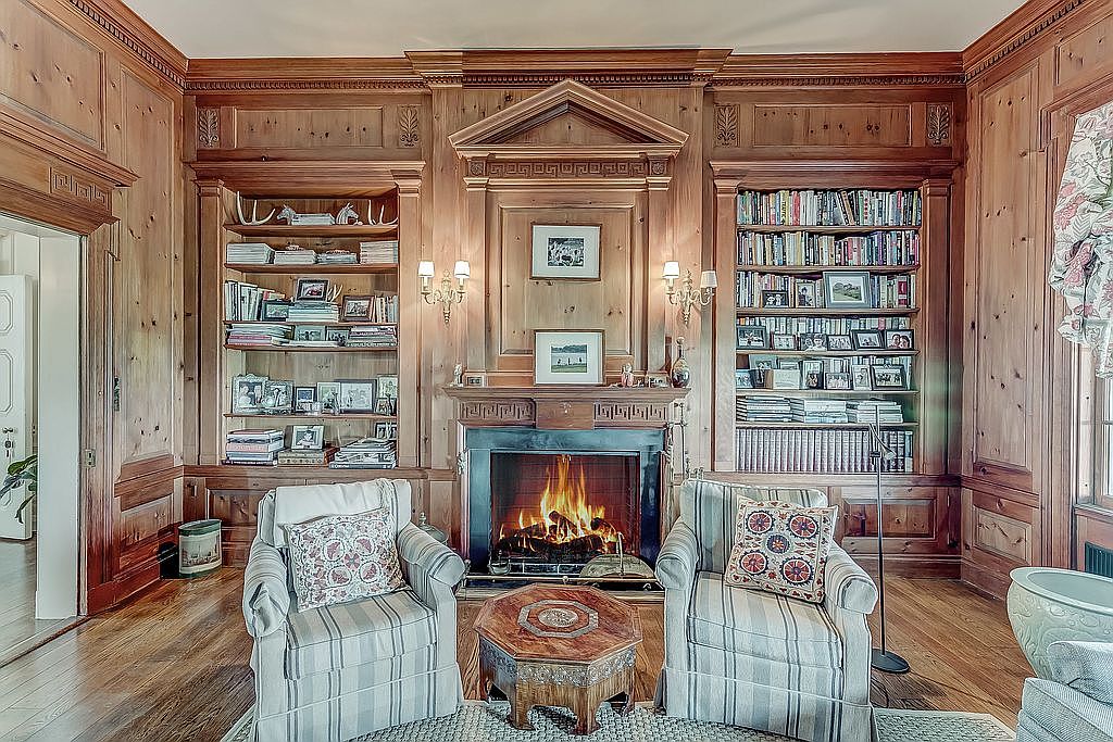 The living room features rich wooden paneling that creates a warm and inviting atmosphere. A classic fireplace serves as the focal point, flanked by elegant sconces that provide soft lighting. To one side, a built-in bookshelf showcases a collection of books and framed photographs, enhancing the room’s personal touch. Two plush armchairs, upholstered in striped fabric, invite relaxation, accompanied by a unique octagonal coffee table. The floor, finished in polished wood, complements the overall aesthetic. Decorative elements like patterned cushions and a decorative rug add texture, while large windows allow natural light to brighten the cozy space.