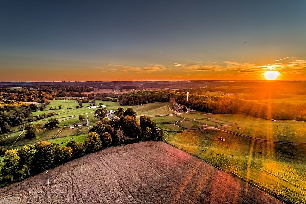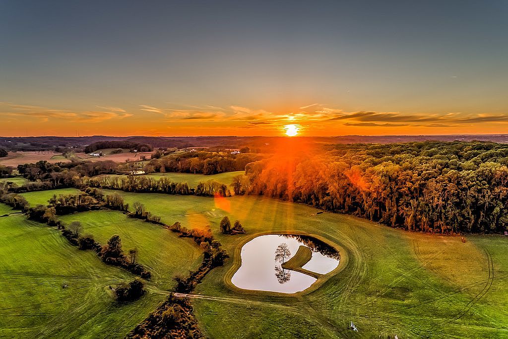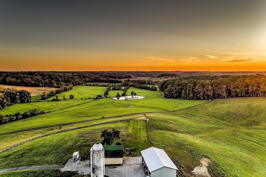 This panoramic view captures the expansive countryside, showcasing lush, rolling green hills dotted with trees and farmland. A tranquil body of water reflects the warm hues of a setting sun in the background, creating a serene atmosphere. A white barn with a cylindrical silo adds rustic charm, blending with the landscape. Fencing outlines the fields, enhancing the pastoral charm, while the horizon reveals a mix of vibrant orange and subtle purple shades as day transitions into evening. Patches of varying green intensities from the grass highlight the texture of the terrain, evoking a sense of peace and natural beauty.