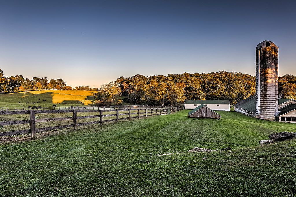 A breathtaking landscape showcasing a sprawling countryside at sunset. Rolling hills extend into the distance, adorned with rich greens and golden hues from the setting sun. The sky transitions from deep blue to warm oranges and pinks, casting a soft glow over the fields. Fenced pastures dot the scene, interspersed with trees displaying autumn colors, adding depth and contrast. A barn and silo are visible, hinting at agricultural use. Traces of plowed earth weave through the fields, enhancing the pastoral charm. The overall feel is tranquil and picturesque, embodying the serene beauty of rural life.