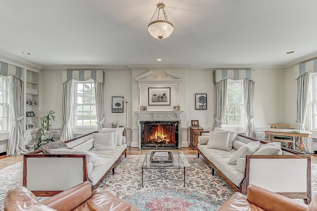 The living room features an elegant arrangement centered around a fireplace with a classic mantel. Neutral walls enhance the soft overall aesthetic, while large windows dressed in striped curtains allow ample natural light. A mix of furniture includes white sofas with wooden frames and brown leather chairs, providing comfort and style. The layout promotes conversation, with a glass coffee table atop a vibrant area rug that adds color and texture. Built-in bookshelves flank the fireplace, decorated with framed photographs and plants, reflecting personal touches. Crown molding and a stylish light fixture above contribute to the room’s refined ambiance.