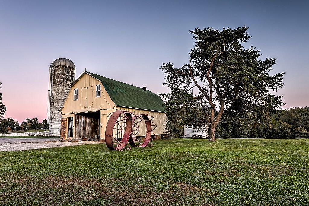 The farmhouse features a quaint design with a classic barn style, highlighted by its yellow wooden siding and a prominent green gabled roof. Adjacent to the main structure stands a tall, cylindrical silo, creating a harmonious countryside aesthetic. A large, open pasture surrounds the building, with lush green grass leading up to a decorative sculpture that adds an artistic touch. The scene is framed by a solitary tree, which gives an inviting rustic charm. The soft hues of dusk provide a gentle backdrop, enhancing the serene and pastoral atmosphere of the property.