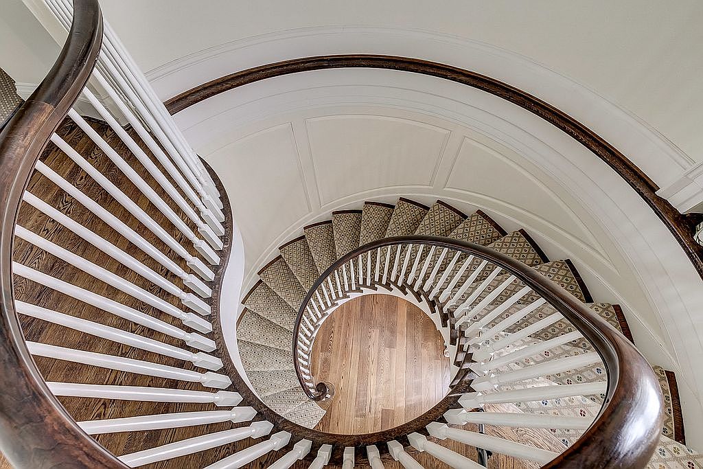 This image showcases an elegant spiral staircase, featuring a rich wooden handrail that contrasts with the white balusters. The smooth transition of the stairs, paired with a carpet runner adorned with a subtle geometric pattern, enhances the upscale aesthetic. Natural light floods the space, highlighting the sleek hardwood floor beneath. The walls are painted in soft, neutral tones, creating a harmonious backdrop that complements the architectural details, such as the curved wall at the base of the stairs. This design seamlessly merges functionality with sophistication, inviting movement between levels in style.