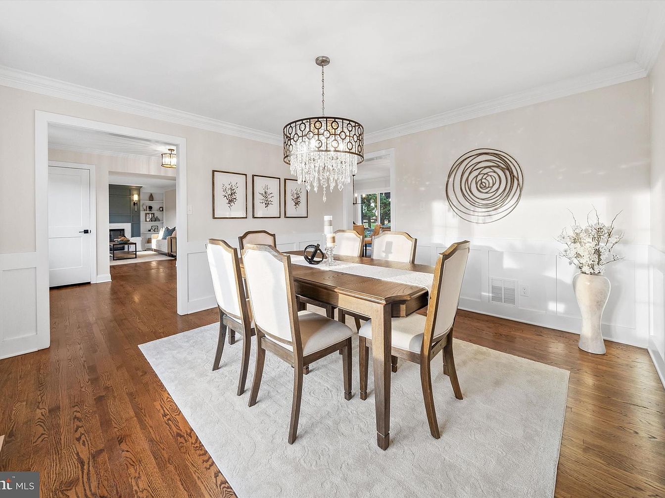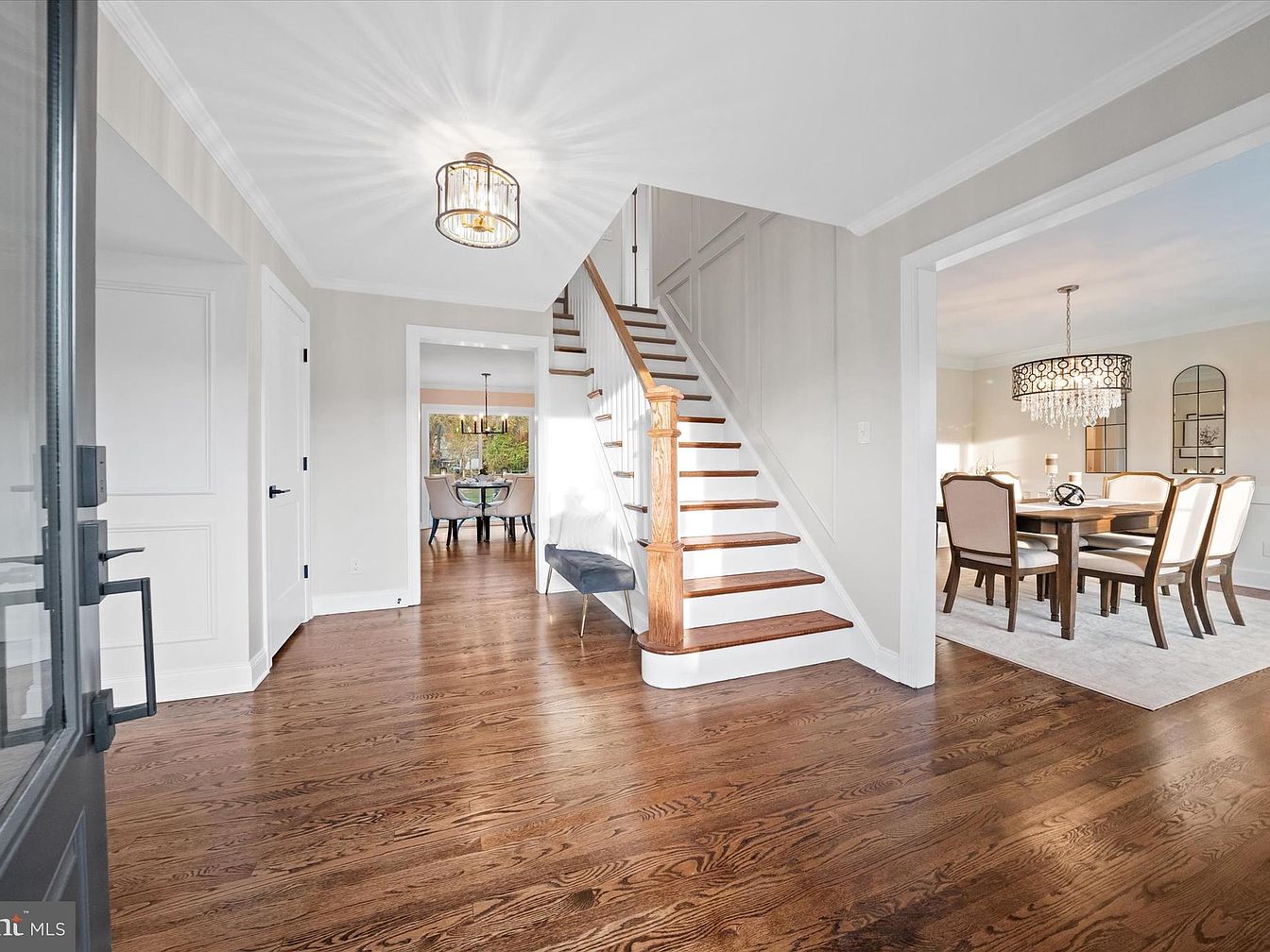 A welcoming entryway features a rich, polished hardwood floor that adds warmth and elegance. The space is illuminated by a stylish light fixture, casting an inviting glow. To the left, a sleek staircase with wooden steps and white risers leads to the upper levels. The walls are painted in soft neutral tones, enhancing the room’s brightness. To the right, a glimpse of the dining area is visible, showcasing a round table surrounded by upholstered chairs. Architectural details include crown molding and wainscoting, enhancing the classic aesthetic while providing a seamless flow to adjacent spaces.