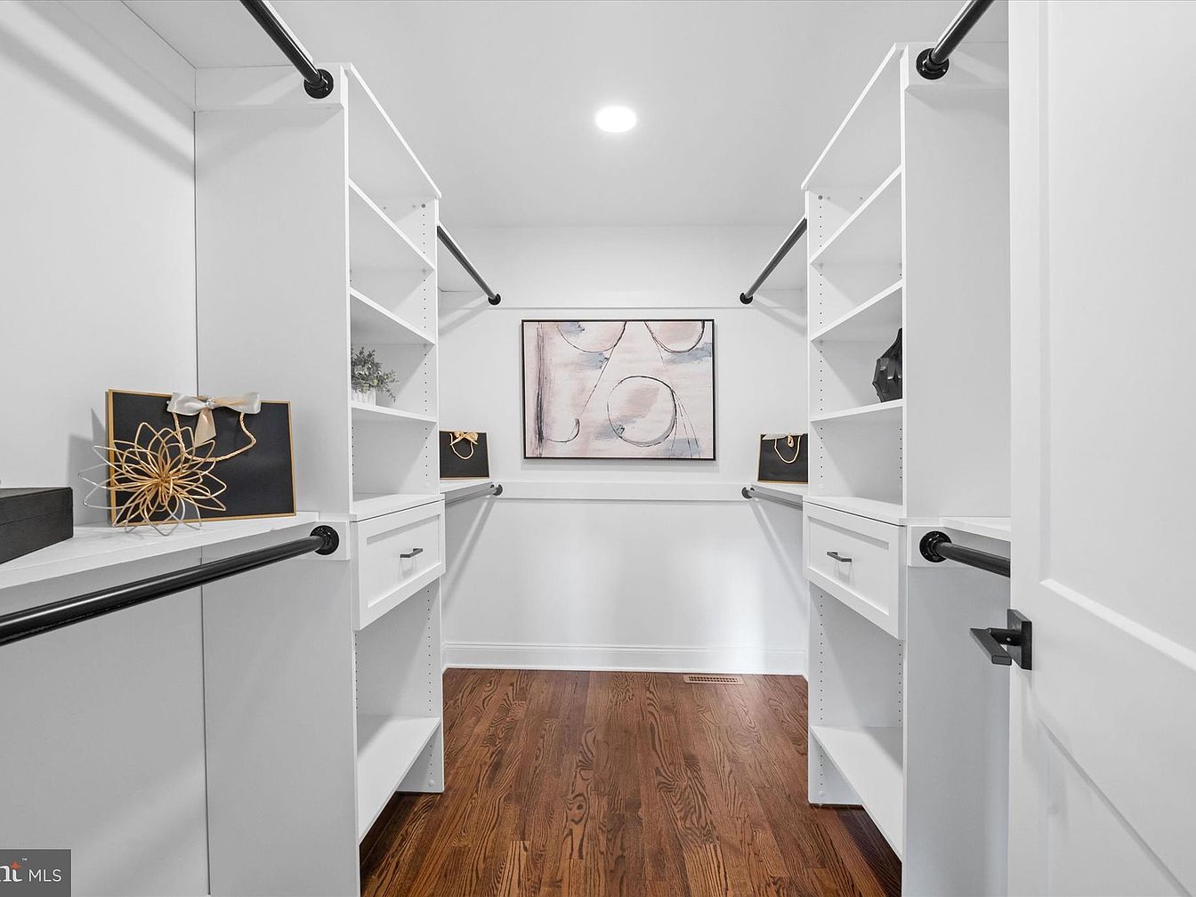 This spacious walk-in closet features a minimalist design with an emphasis on functionality. White shelves and hanging rods create an organized look, enhancing the sense of space. The wooden floor is a warm, rich brown, providing a contrast to the bright walls. Decorative elements such as black boxes with gold accents add sophistication. An abstract piece of art hung on the far wall introduces a subtle accent of color, while the overhead lighting ensures the area is well-lit. This blend of practicality and style makes it an inviting area for clothing and accessories.