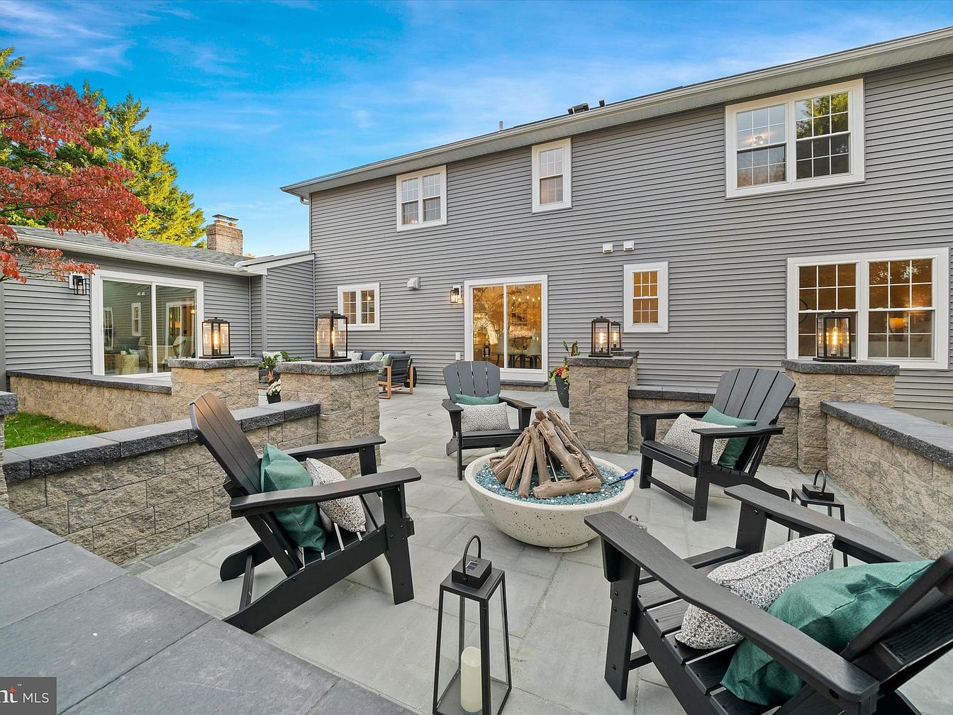 A spacious outdoor patio features a harmonious blend of stone and slate, creating a modern yet cozy atmosphere. Dark wooden adirondack chairs surround a central firepit, accented with vibrant green cushions. The patio’s perimeter includes textured stone walls, offering both definition and warmth. Soft lighting from stylish lanterns enhances the welcoming vibe, while lush greenery flanks the area, contributing to natural beauty. Large, inviting windows of the adjacent structure allow glimpses into the interior, suggesting a seamless indoor-outdoor connection. The serene blue sky above completes the picturesque setting, perfect for gatherings or quiet relaxation.