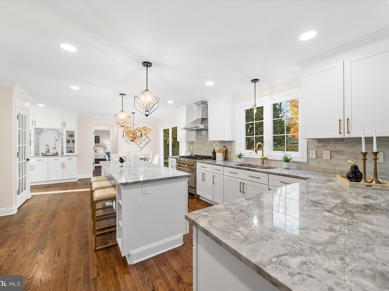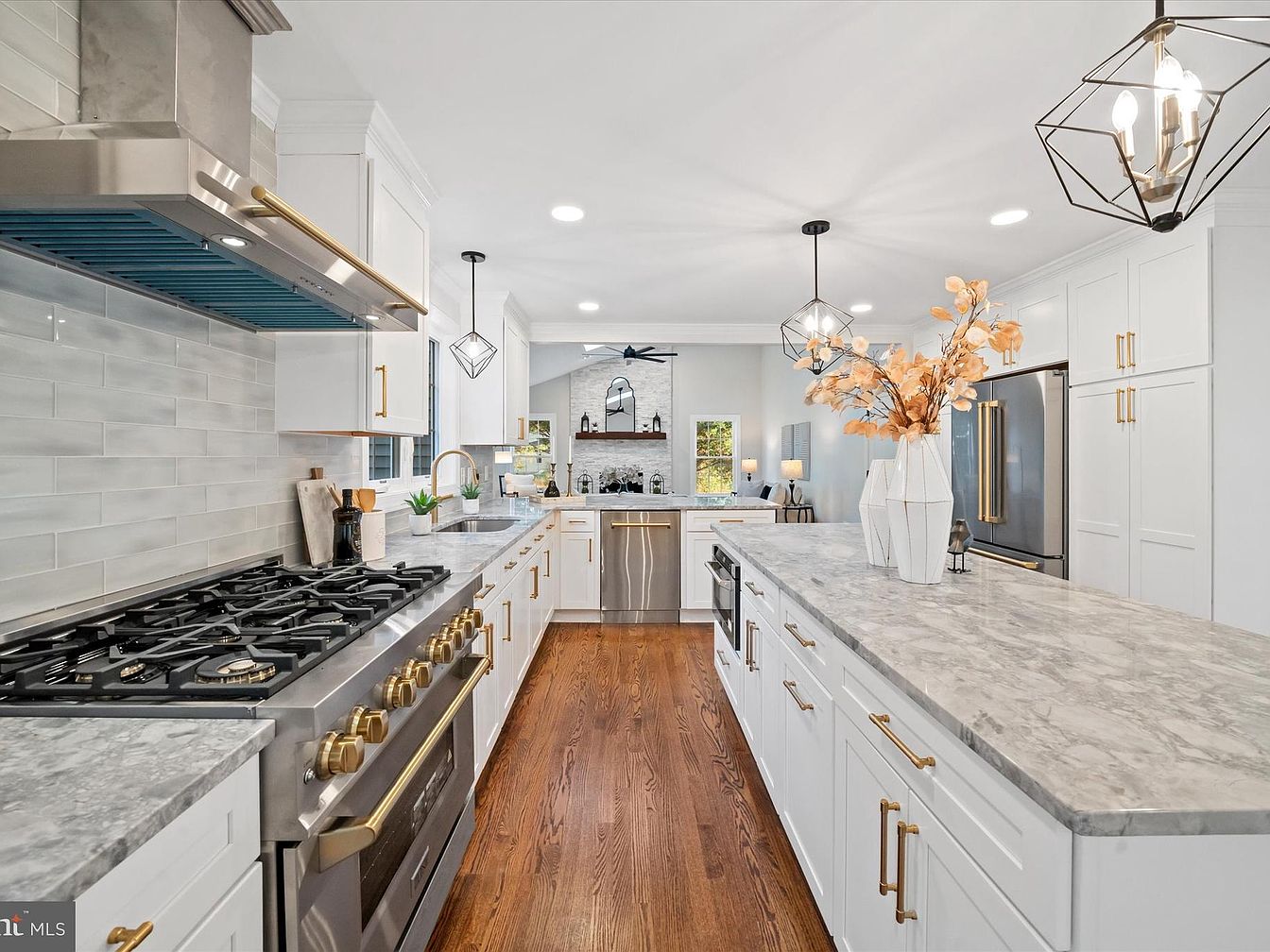 This spacious kitchen features a sleek layout with a central island topped in marble, promoting functionality. White shaker cabinets with elegant gold hardware enhance the modern aesthetic, complemented by a textured backsplash in soft gray tones. A professional-grade gas range and stainless steel appliances showcase culinary ambition. Decorative light fixtures in geometric shapes cast warm illumination across the space. A stylish vase with dried floral elements adds a touch of natural beauty. The rich hardwood flooring contrasts beautifully with the bright walls, creating a welcoming and sophisticated environment ideal for cooking and entertaining.