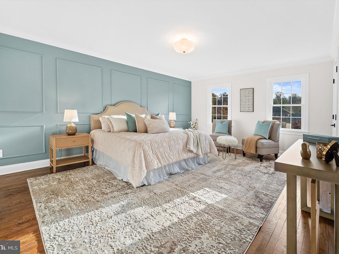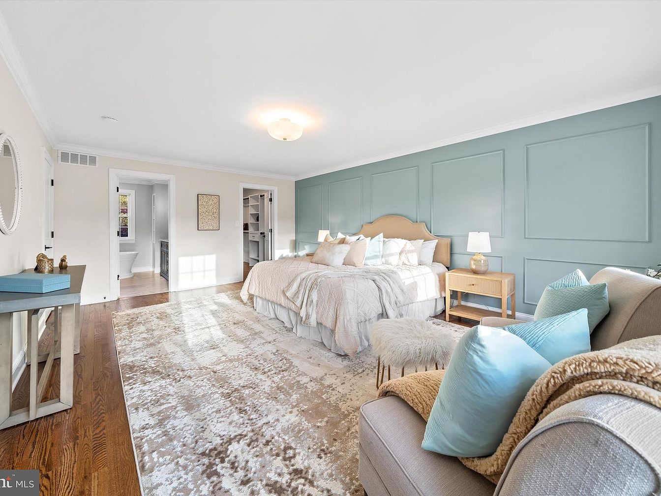 This spacious bedroom features a soothing palette of soft whites and muted teal accents on the wall. A plush king-sized bed, adorned with an array of textured pillows and a cozy throw blanket, invites relaxation. Flanking the bed are minimalistic nightstands, each topped with stylish lamps for warm lighting. The hardwood floor is softened by a large, patterned area rug that complements the bedding. A comfortable seating area with a light-colored sofa and decorative pillows creates a nook for reading. Architectural details include crown molding and elegant paneling, enhancing the room’s sophisticated charm.