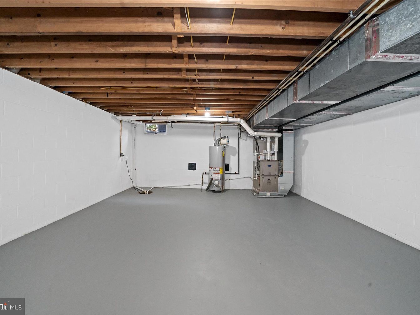 A functional basement with a clean, minimalist aesthetic. The floor is coated in a smooth, light gray finish, enhancing the sense of spaciousness. White-painted concrete walls lend a bright, airy quality, contrasting with the exposed wooden beams of the ceiling, showcasing the structural elements. Utility appliances, including a furnace and water heater, are neatly arranged against one wall, emphasizing practicality. A small window provides natural light, contributing to the overall brightness of the space. The open layout allows for versatile usage, making it ideal for storage, a workshop, or a recreational area.