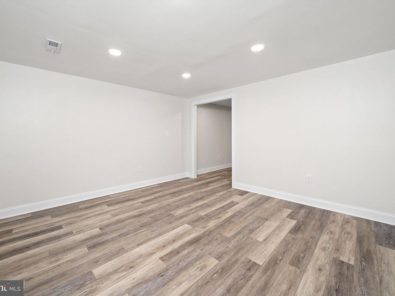 A spacious bonus room with a neutral palette is showcased. The walls are painted a soft white, providing a clean backdrop, while the light wood-tone flooring adds warmth. Recessed lighting illuminates the space, highlighting its versatility. A doorway is visible on the right, leading to another room, creating a sense of connectivity within the house. The absence of furniture allows for creative customization, encouraging the use of the area as a playroom, office, or guest space. The overall aesthetic promotes a serene, modern atmosphere, suitable for numerous activities and personal touches.