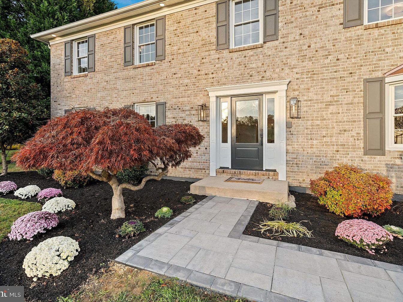 The front entrance features a charming brick facade complemented by classic gray shutters framing tall windows. A bold dark door welcomes guests, accentuated by elegant wall sconces on either side. A smooth stone pathway leads from the driveway to the steps, enhancing accessibility. Lush landscaping showcases a striking, pruned maple tree with rich red foliage, along with colorful flower beds sprinkled with white and pink chrysanthemums, radiating warmth and inviting vibrancy. The carefully chosen plants contrast beautifully against the dark mulch, highlighting the neat and orderly design of the exterior, reflecting an inviting atmosphere.