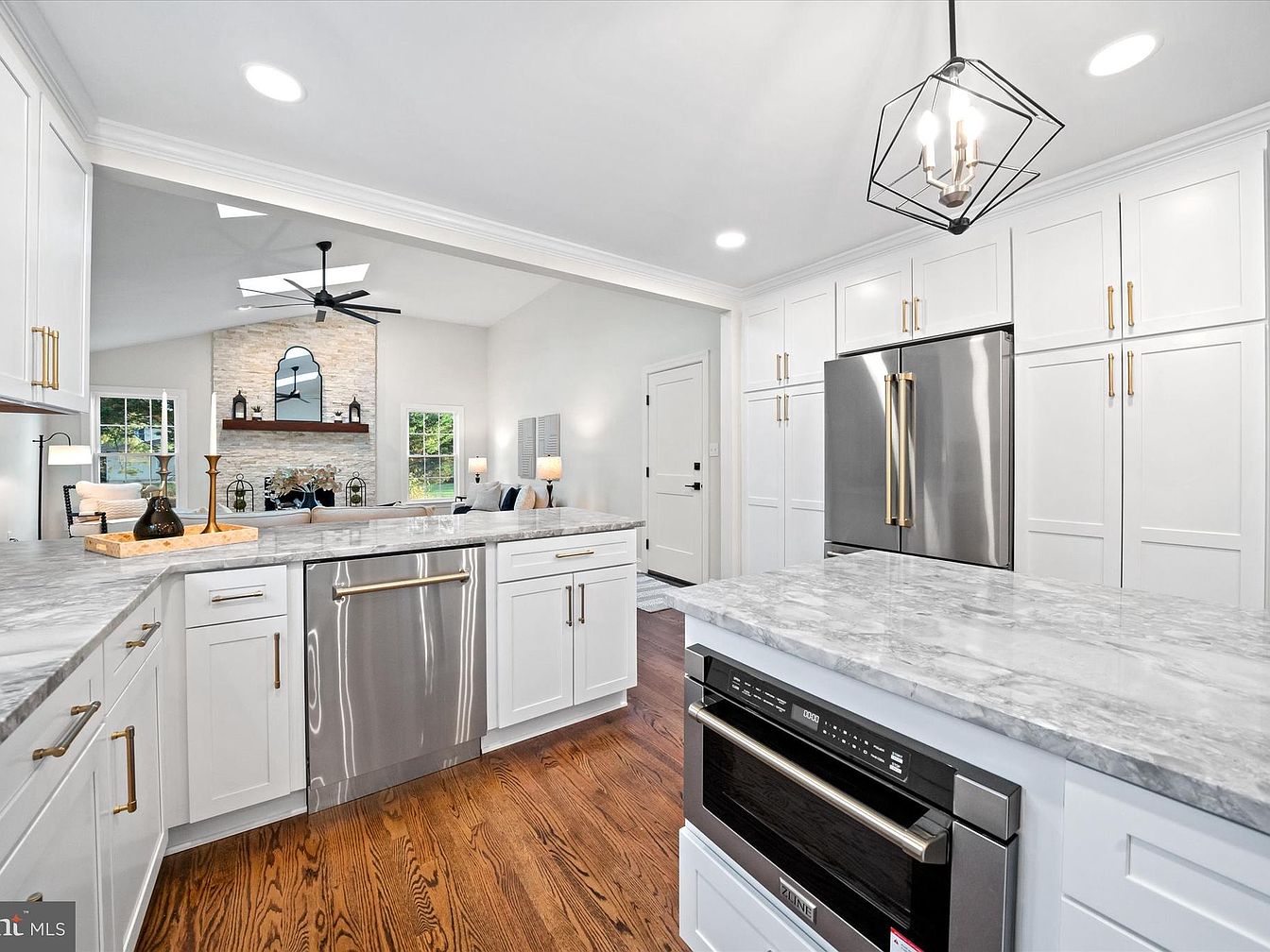 The kitchen features a modern layout with elegant white cabinetry adorned with sleek gold hardware. A large island with a luxurious gray marble countertop offers ample space for meal preparation. The stainless steel appliances, including a refrigerator and a dishwasher, contribute to a contemporary aesthetic. Natural light floods in through the windows, accentuating the warm wooden floor. In the background, a stylish stone fireplace serves as a focal point, enhancing the inviting atmosphere. A geometric pendant light hangs above the island, adding a touch of sophistication to the bright and airy space, perfect for both cooking and entertaining.