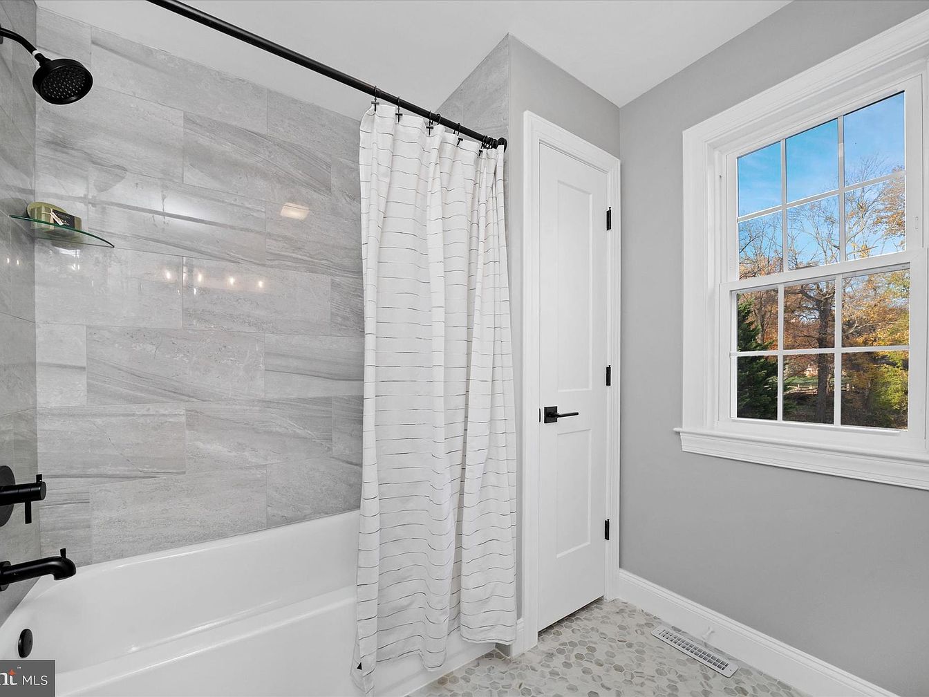 This bathroom features a sleek, modern design emphasizing light and space. The walls are adorned with large, polished gray tiles, imparting a clean and sophisticated look. A white bathtub with a chrome shower fixture sits against the tiled wall, while a clear glass shelf holds toiletries above. The black shower rod and modern showerhead add a striking contrast. Natural light streams through the large window, showcasing trees outside, while the light gray paint on the walls harmonizes with the overall palette. A textured, circular pebble tile floor enhances the organic feel, complementing the contemporary aesthetic.