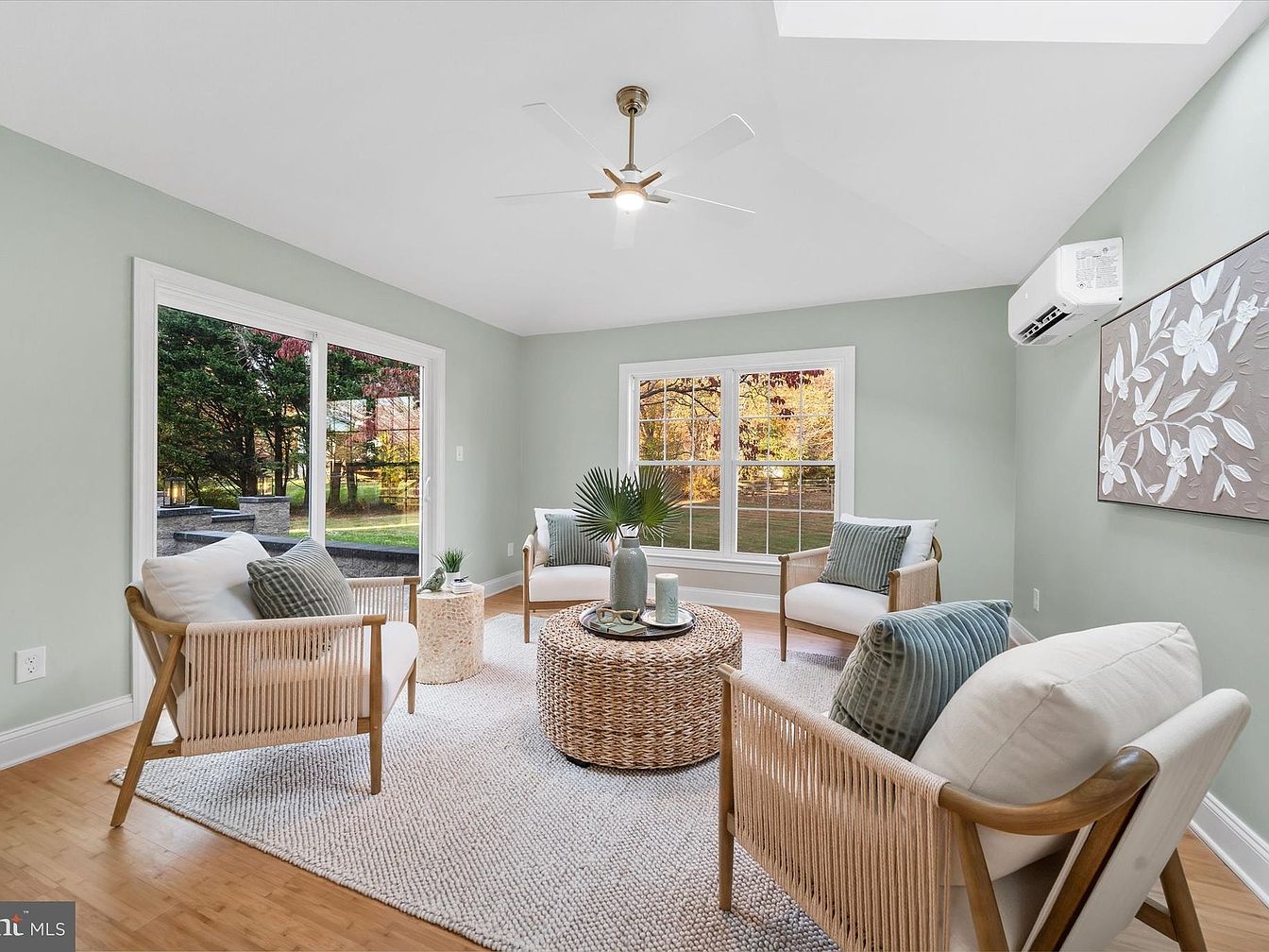 This sunroom features large windows that invite natural light, showcasing a serene view of the backyard. The walls are painted a soft mint green, complementing the light bamboo flooring. Furnished with two stylish, woven-accent chairs adorned with plush cushions in muted tones, a circular woven coffee table serves as a centerpiece. A textured area rug adds warmth, while a decorative piece on the wall incorporates floral motifs, enhancing the tranquil ambiance. An overhead ceiling fan offers functionality without detracting from the aesthetic. The overall design fosters a welcoming space perfect for relaxation and enjoying nature.