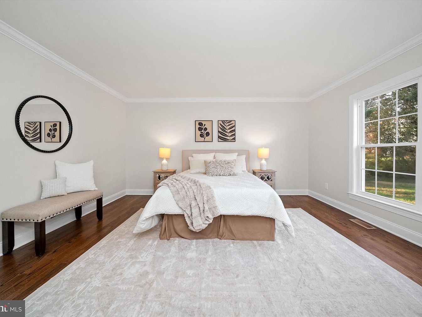 A serene bedroom featuring warm wooden flooring paired with a large area rug that adds softness underfoot. The color palette is tranquil, dominated by soft whites and beiges, creating a calming atmosphere. A plush bed with a stylish beige upholstered headboard is adorned with cozy throw pillows and a textured blanket. Next to the bed, a sleek wooden nightstand holds a simple lamp, providing warm light. On the opposite wall, a round mirror reflects light artfully, while framed botanical prints add a touch of greenery. A large window allows natural light to flood the space, enhancing its inviting feel.