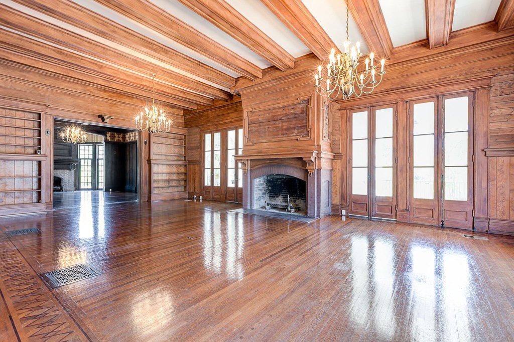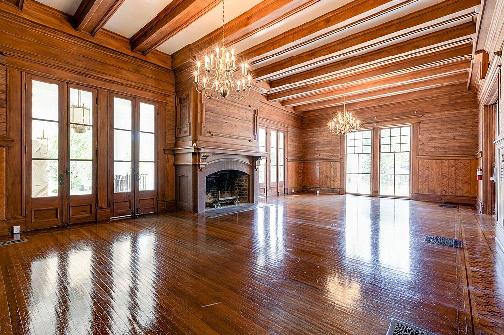 Expansive space dominated by rich wood paneling and beams on the ceiling, creating a warm, historic ambiance. Gleaming hardwood floors feature an intricate inlaid border, reflecting natural light streaming in from tall French doors along one wall. Two ornate chandeliers add an elegant touch and complement the classic, oversized wooden fireplace that serves as the room’s focal point. Built-in shelves line parts of the walls, suggesting ample room for books or display items. Wide doorways open into an adjoining room, continuing the cohesive woodwork and traditional details, emphasizing an inviting, stately atmosphere ideal for gatherings.
