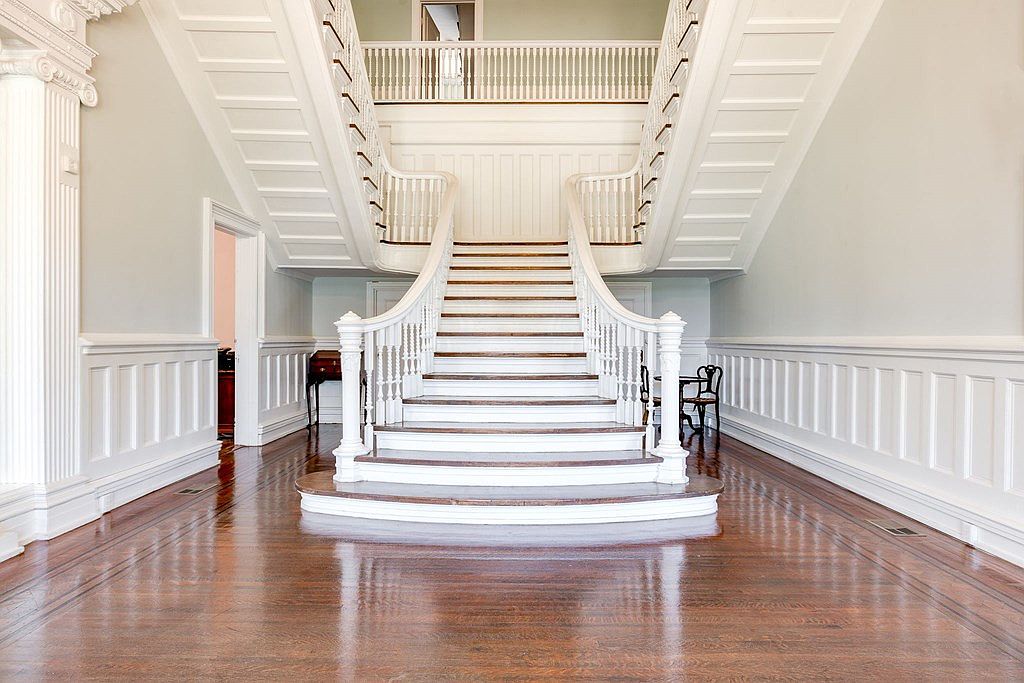 A broad, sweeping staircase is the focal point, featuring dark stained wooden steps contrasting with bright white risers and intricately turned balusters. Wide, decorative handrails curve gracefully at landings and turns, creating a sense of elegance and grandeur. The walls are adorned with crisp white wainscoting, complementing the pale sage green of the upper walls. An abundance of natural light floods in through large multi-pane windows, illuminating the space. The ceiling is high, further accentuated by heavy moldings and a chandelier. The architectural details and soft color palette evoke a sense of historic charm and stately sophistication.