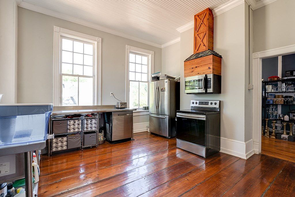 Spacious kitchen featuring high ceilings with beadboard paneling and wide plank, polished hardwood floors with a rich, amber tone. Two large, grid-paned windows allow natural light to brighten the space, accented by classic white trim and pale dove gray walls. The room features modern stainless steel appliances, including a refrigerator, dishwasher, range, and a microwave set beneath a farmhouse-inspired wooden hood vent. Minimalist metal shelving under the long counter provides open storage with fabric bins. An open doorway leads into an adjoining pantry or dining area, stocked with glassware and gold-toned candle holders, adding a touch of historic charm.