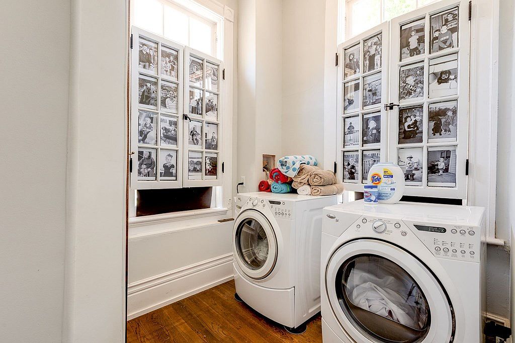 This laundry room features two modern, front-loading machines placed side by side on a warm-toned hardwood floor. Above the machines, neatly folded towels and laundry supplies rest, adding a touch of practicality and lived-in charm. Large windows allow abundant natural light, but are partially covered by unique white shutters displaying black-and-white family photographs, infusing the space with personal history and warmth. The trim and walls are painted a soft white, accentuated by classic molding, creating a bright, clean, and inviting atmosphere that mixes historic character with everyday functionality.