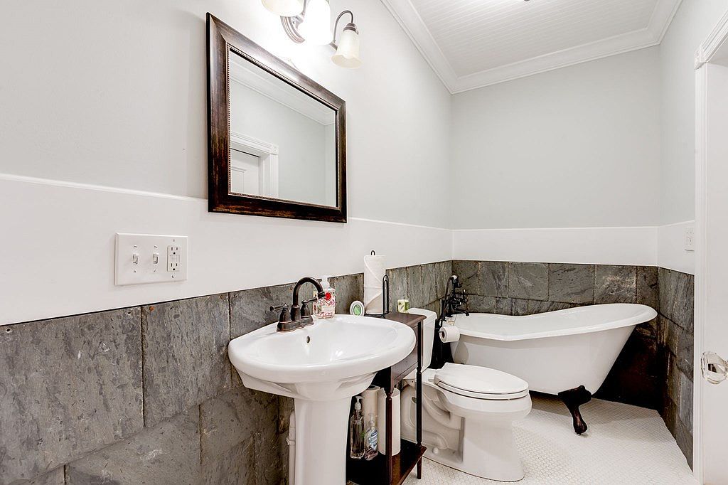 A bright and airy bathroom with a traditional clawfoot bathtub positioned in the corner, complemented by a white pedestal sink and a simple white toilet. The lower half of the walls features dark gray slate tiles, while the upper sections are painted a soft, light gray. A large, dark wooden-framed mirror is mounted above the sink. Overhead, a double-bulb light fixture adds a warm glow, and the ceiling is finished with white painted wood paneling, creating a subtle yet elegant touch. Clean lines and classic fixtures blend with rustic accents for a timeless, inviting look.