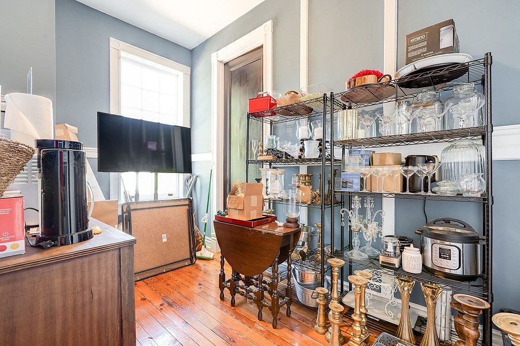 A functional storage nook with ample daylight streaming in through a large window set in a soft blue-gray wall. Tall white trim frames the window and doors, adding a classic touch. Against one wall, two black metal shelving units hold an eclectic mix of glassware, vases, kitchen appliances like an Instant Pot, and boxes. A folding drop-leaf table sits in the center, surrounded by decorative gold candlesticks. The wooden floor has a natural warm finish, and a dark wooden cabinet occupies the foreground, supporting a coffee maker and essentials. The space feels utilitarian but tinged with vintage elegance.