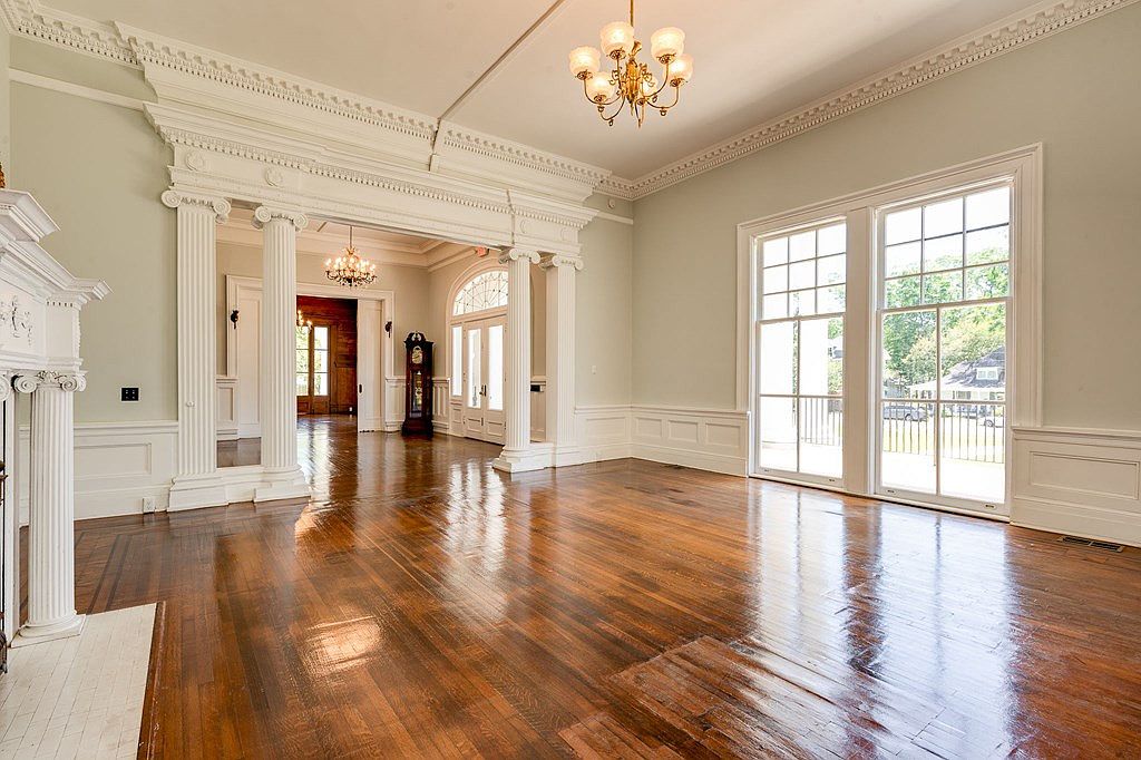 A spacious, light-filled living room features elegant architectural details including tall, white fluted columns, intricate crown molding, and a classic white mantel on the left. Gleaming, wide-plank hardwood floors add warmth and a sense of history. Large windows on the right wall welcome natural light and offer a view of a sun-filled lawn outside. The soft, pale wall color contrasts beautifully with the crisp white trim and wainscoting. Crystal chandeliers hang from the high ceiling, enhancing the grandeur. Through the columns, a hallway reveals a grandfather clock, another chandelier, and a glimpse of wooden double doors.
