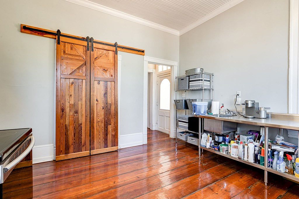 Spacious pantry area featuring glossy, wide-plank hardwood floors and soft gray walls with crisp white trim. At the center is a large, rustic sliding barn door made of rich, warm-toned wood, mounted on black metal hardware, adding farmhouse charm. On the right side, a stainless steel countertop runs the length of the wall, supported by open steel shelving filled with cleaning supplies and household products. Above the counter, steel wire shelves hold baskets and storage bins, creating an organized and functional space. Ample natural light filters in through a tall window, enhancing the airy, utilitarian atmosphere.