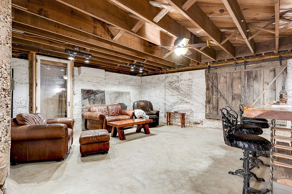 A spacious basement area features exposed wooden beams on the ceiling and concrete flooring, giving an unfinished yet rustic feel. Large, well-worn brown leather armchairs and a matching ottoman create a cozy seating arrangement around a sturdy wooden coffee table. The walls are textured with natural limestone and whitewashed, giving a historic look, complemented by a sliding barn-style wooden door. In one corner, a small bar area with ornate metal and leather bar stools introduces an element of vintage charm. The lighting includes hanging track lights and a ceiling fan light, enhancing the room’s warm, earthy ambiance.