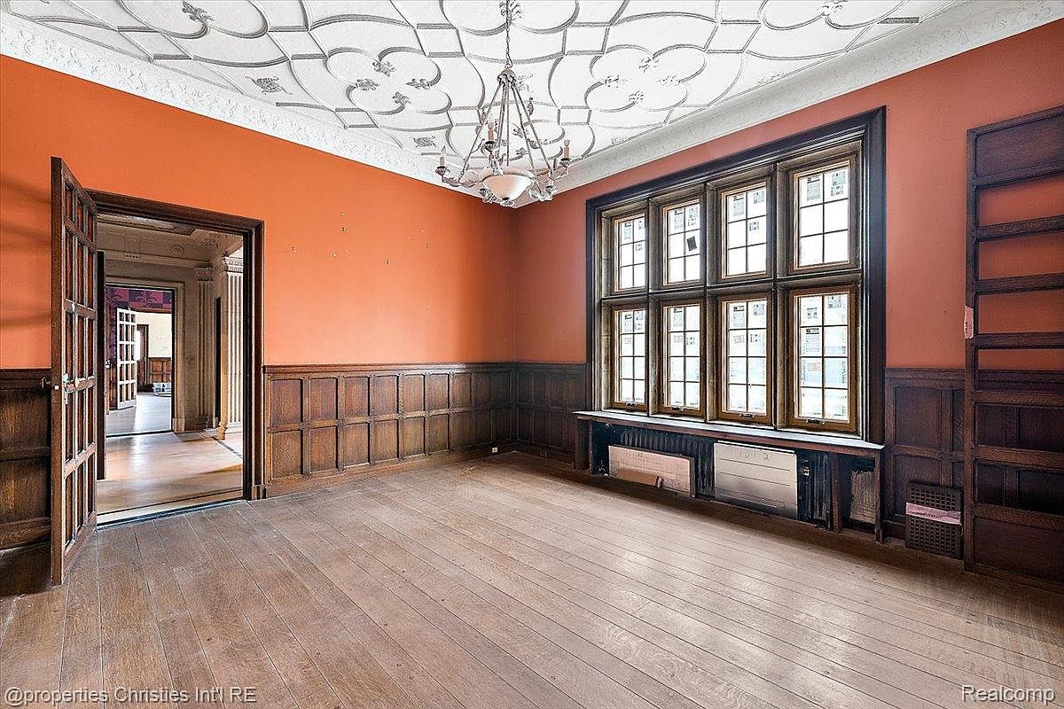 This room features an ornate white plaster ceiling with intricate patterns, adding a sense of elegance and history. The upper walls are painted a warm burnt orange, while the lower half is covered in dark wood paneling for a classic, stately feel. Large, divided-light windows framed in dark wood bring in abundant natural light and overlook the outdoors. The wooden floor continues the historic ambiance, with subtle wear adding character. A metal chandelier hangs centrally, emphasizing the room’s original grandeur. Double doors with carved details open into a spacious hallway with additional period architectural elements visible beyond.
