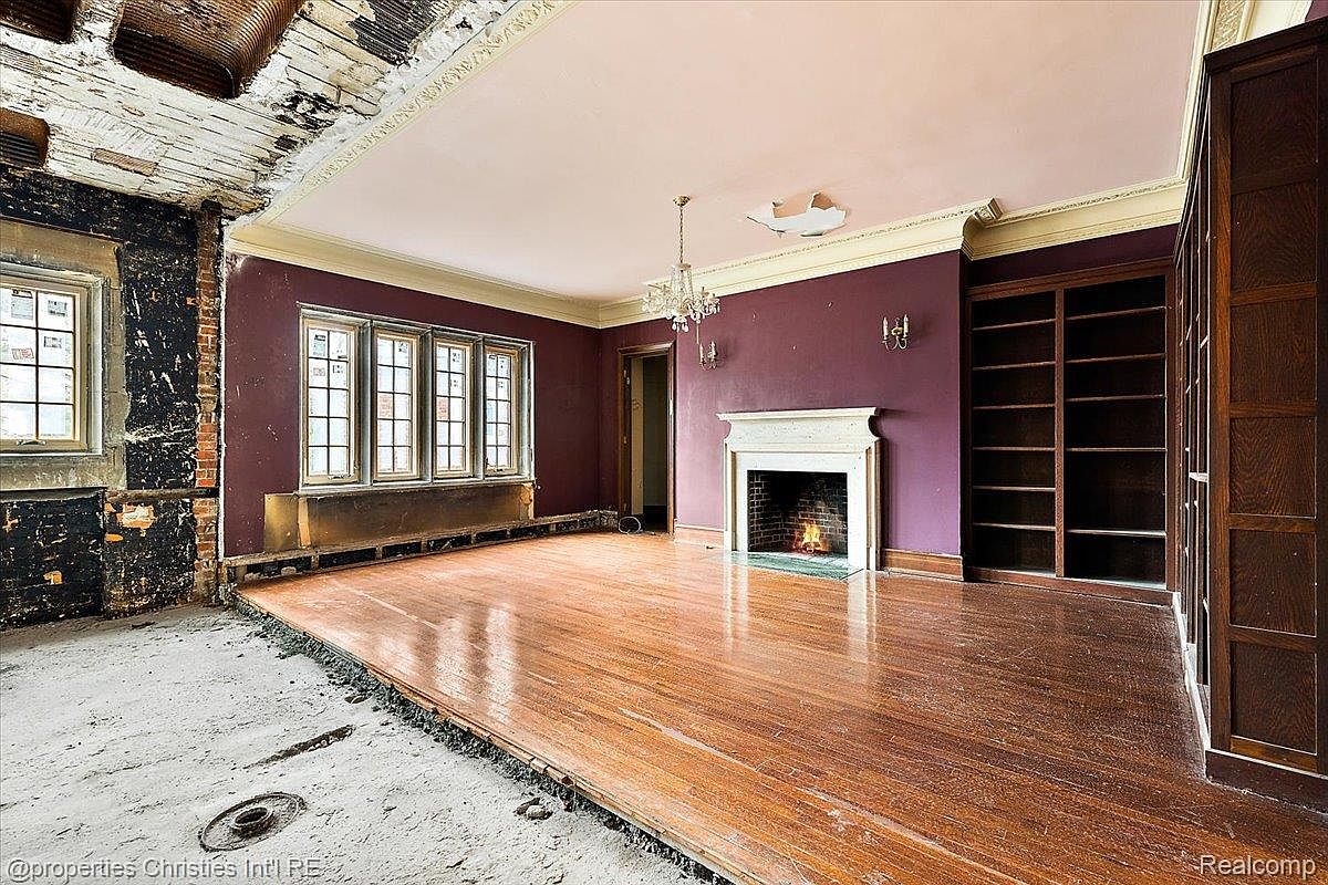 A spacious living room with an elegant white fireplace centered against a deep plum-colored accent wall. Rich, polished wood floors catch the light, but portions of the floor and wall show signs of renovation and disrepair. Tall windows with classic grilles let in daylight, flanked by exposed brick and plaster. Ornate crown molding runs along the ceiling’s edge, framing light damage and peeled paint overhead. Wall sconces and a modest chandelier add historical charm. Large built-in wood bookshelves occupy the right corner, suggesting a space once full of warmth and character, now awaiting restoration.