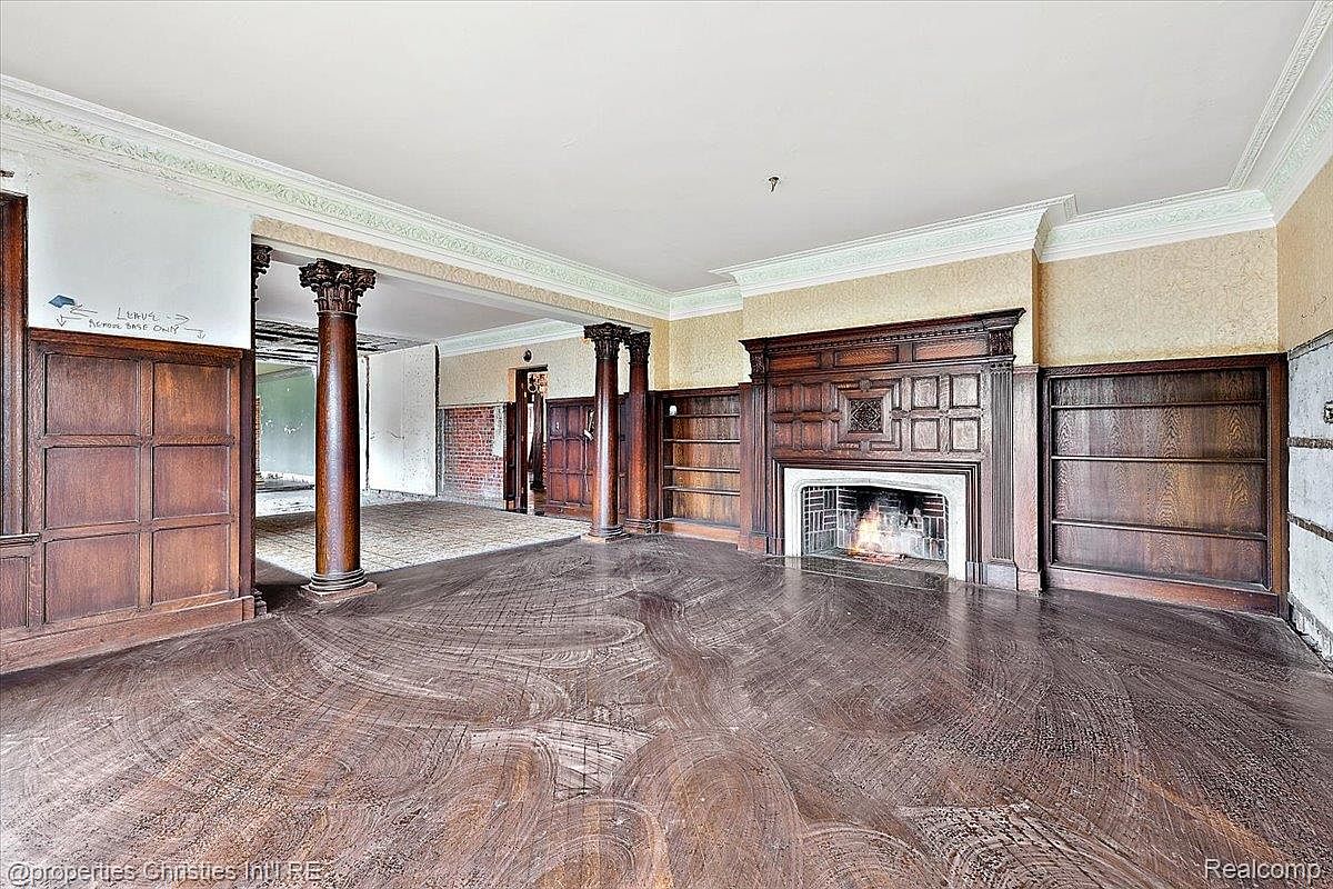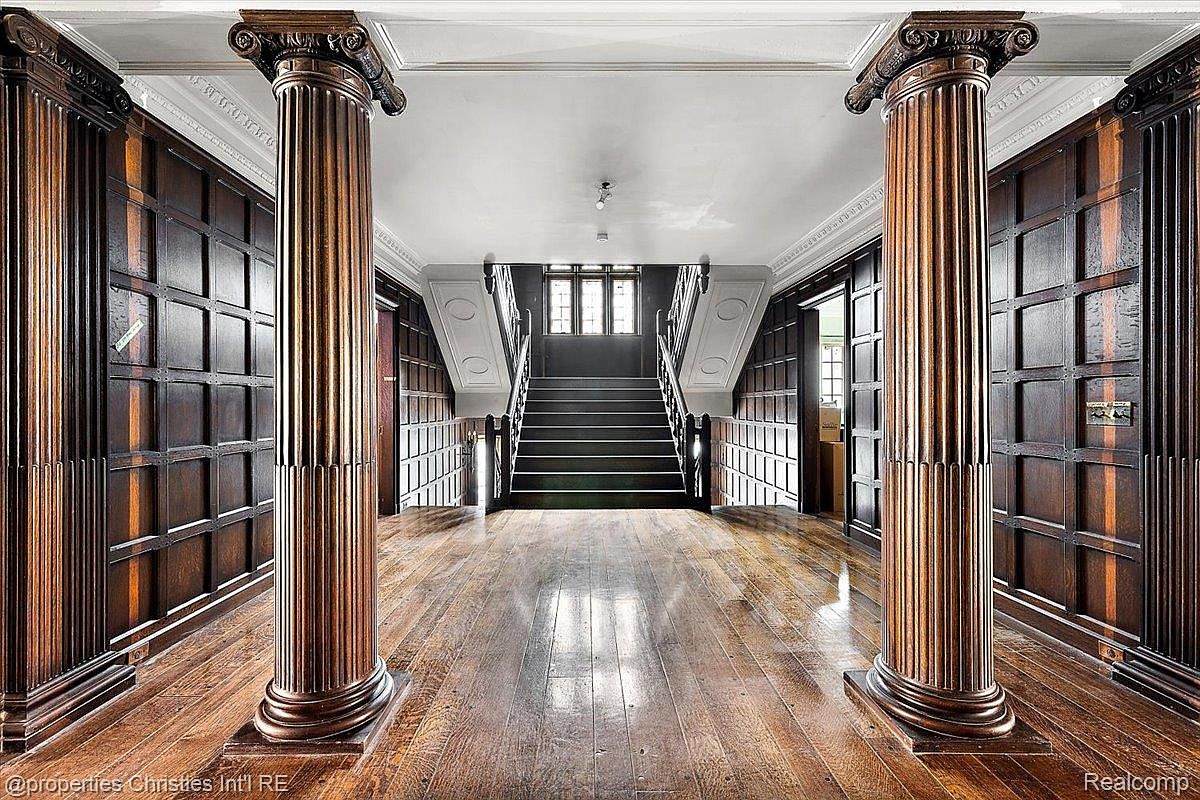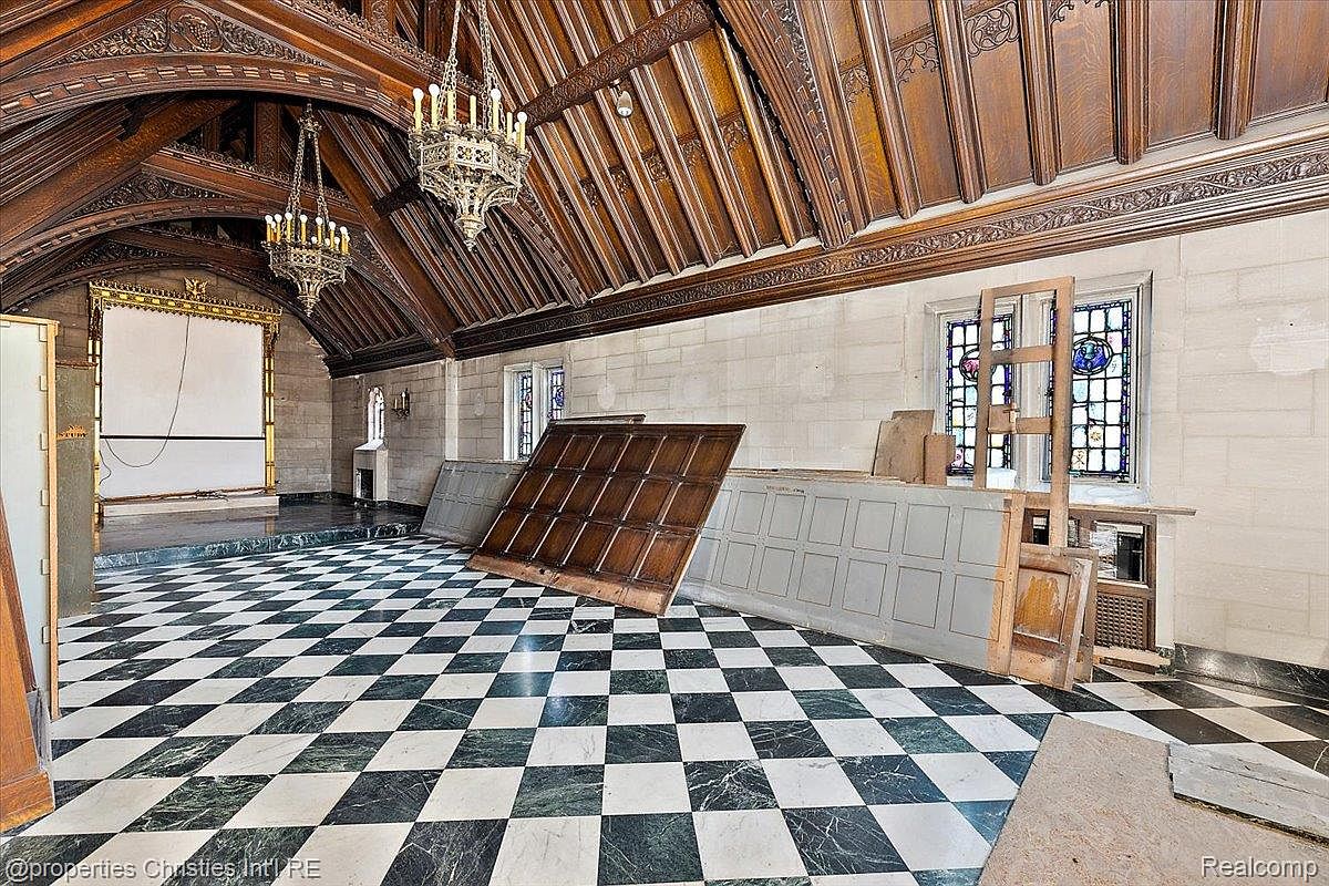 The Bishop Mansion is an extraordinary example of 1920s Tudor Revival architecture, situated on over two gated acres in the prestigious Palmer Woods neighborhood of Highland Park, Michigan. Built for Bishop Michael J. Gallagher, this nearly 40,000-square-foot estate boasts four levels and features such remarkable original details as a private chapel with soaring vaulted ceilings, intricate stained glass, and carved stonework, plus multiple limestone fireplaces and grand formal spaces. The carriage house and attached garage have been fully restored and renovated, while the main house has undergone strategic demolition with modern HVAC, plumbing, and electrical updates underway. Listed at $1,000,000, this iconic Detroit mansion presents a rare opportunity to restore and complete a true legacy property near Downtown and the Detroit Golf Club.