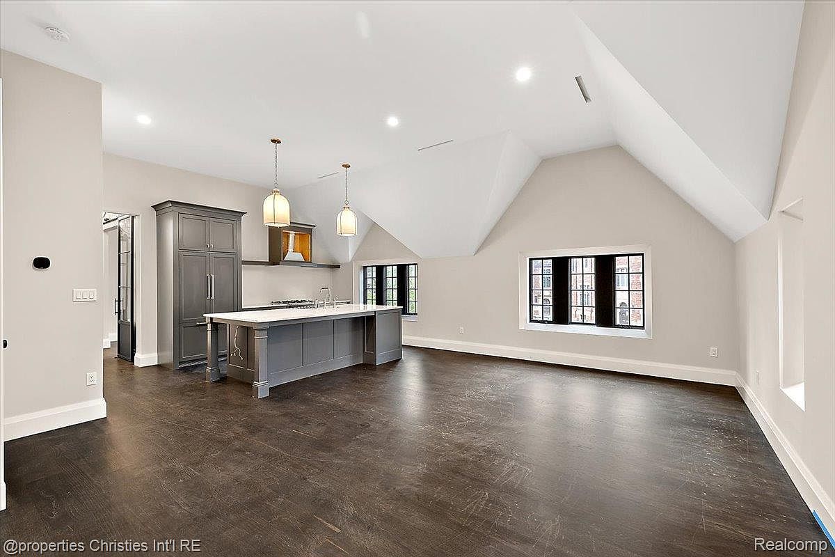 Spacious open kitchen area with a modern yet classic feel, featuring dark hardwood flooring that anchors the room. A large central island with a marble countertop stands at the heart, accompanied by two pendant lights with gold hardware, providing warm illumination. The cabinetry is a matte gray, both on the floor and as a tall pantry unit, complementing the neutral, soft beige walls. Windows with black trim let in natural light and offer architectural interest, while steeply pitched ceilings with sharp angles and inset lighting contribute to an airy, expansive atmosphere that bridges historic charm and contemporary design.