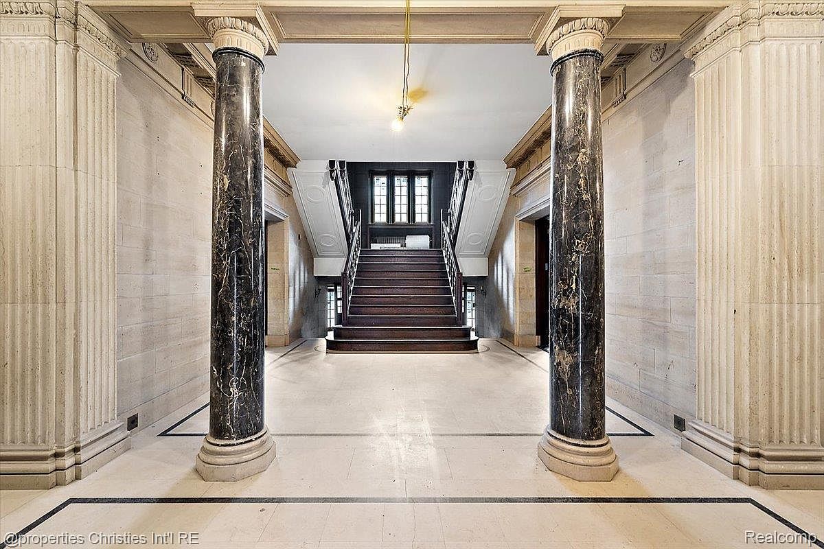 A spacious grand foyer stands out with pale stone tile floors, high ceilings, and exquisite neoclassical detailing on the walls and crown molding. Two striking black marble columns, each topped with ornate capitals, add a sense of formality and grandeur. The foyer flows seamlessly into an adjoining parlor with a decorative plaster ceiling, dark wood paneling, and a dramatic carved stone fireplace. The parlor’s floors are aged wood, and its walls exude a rich, historic character. Large doorways enhance the sense of openness, and geometric trim gives an added elegance throughout both spaces.