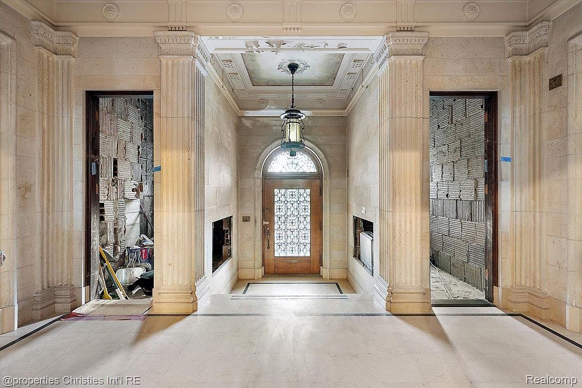 Grand entry hall featuring tall, fluted classical columns framing either side of a hallway. The space uses beige stone or marble for floors and walls, lending a stately, historic ambiance. Ahead, a wooden door with frosted, decorative glass is set beneath an arched transom window, allowing muted daylight into the foyer. The ceiling features ornate plasterwork with decorative moldings and a central hanging lantern-style light fixture, though parts of the paint are peeling. Flanking doors reveal unfinished areas with exposed brick, indicating portions of the renovation are still underway. The overall effect is elegant yet in transition.