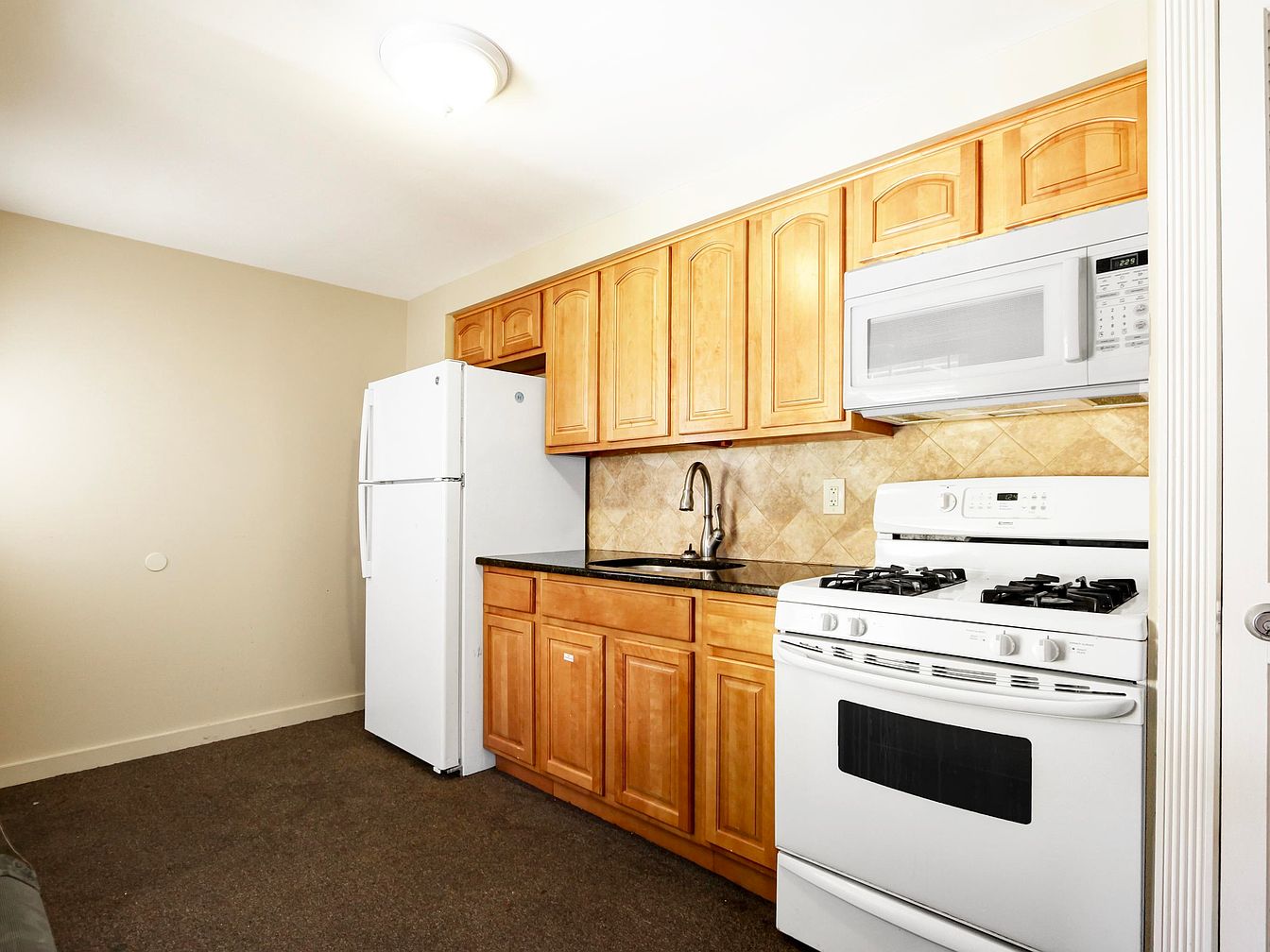 Compact and functional kitchen space featuring honey-colored wooden cabinetry, both above and below a black countertop. The backsplash consists of warm beige tiles in a diamond pattern, complementing the neutral wall color. A white refrigerator and a white gas stove with an oven are positioned side by side, with a matching built-in microwave situated above the stove. A single stainless-steel faucet and sink are set into the counter. The floor is covered in a brown, low-pile carpet, creating an unexpected contrast with the standard kitchen materials. The area is well-lit by a ceiling light, contributing to a bright, practical atmosphere.
